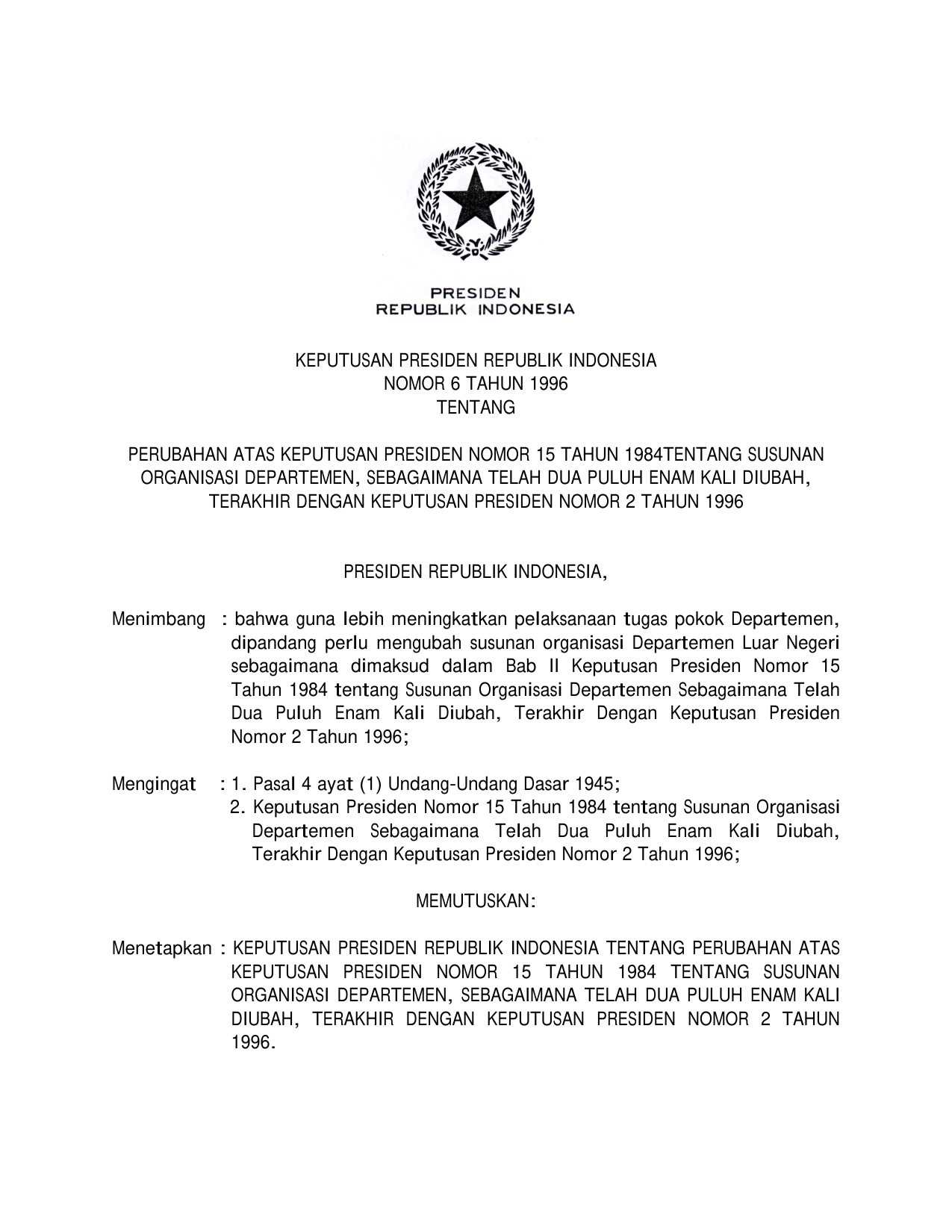 KEPPRES Nomor 6 Tahun 1996 | Keputusan Presiden Nomor 6 Tahun 1996 tentang PERUBAHAN KEPPRES 15-1984 TENTANG SUSUNAN ORGANISASI DEPARTEMEN SEBAGAIMANA TELAH DUA PULUH ENAM KALI DIUBAH TERAKHIR DENGAN KEPPRES 2-1996