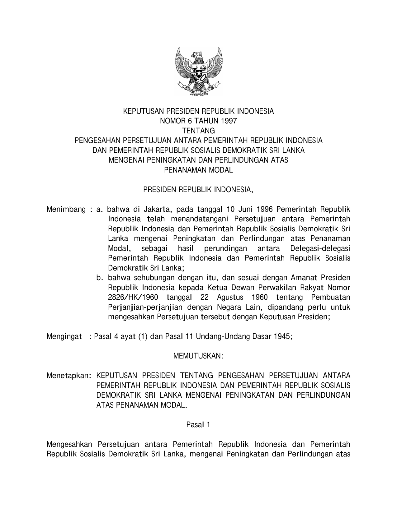 KEPPRES Nomor 6 Tahun 1997 | Keputusan Presiden Nomor 6 Tahun 1997 tentang PENGESAHAN PERSETUJUAN ANTARA PEMERINTAH RI DAN PEMERINTAH REPUBLIK SOSIALIS DEMOKRATIK SRI LANKA MENGENAI PENINGKATAN DAN PERLINDUNGAN ATAS PENANAMAN MODAL