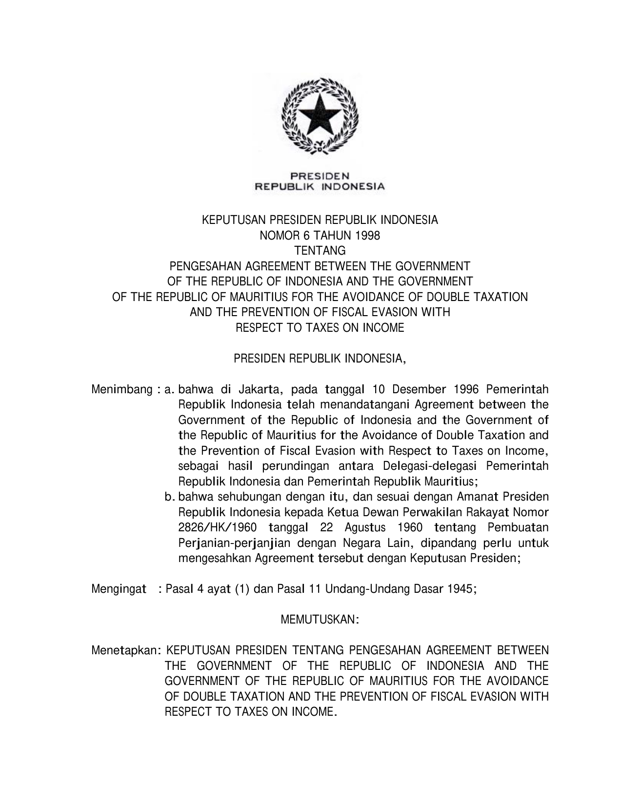 Mengesahkan Agreement between the Government of the Republic of INDONESIA and the Government of the Republic of Mauritius for the Avoidance of Double Taxation and the Prevention of Fiscal Evasion with Respect to Taxes on Income, yang telah ditandatangani Pemerintah Republik INDONESIA di Jakarta, pada tanggal 10 Desember 1996 sebagai hasil perundingan antara Delegasi-delegasi Pemerintah Republik INDONESIA dan Pemerintah Republik Mauritius yang salinan naskah aslinya dalam bahasa Inggeris sebagaimana terlampir pada Keputusan PRESIDEN ini.