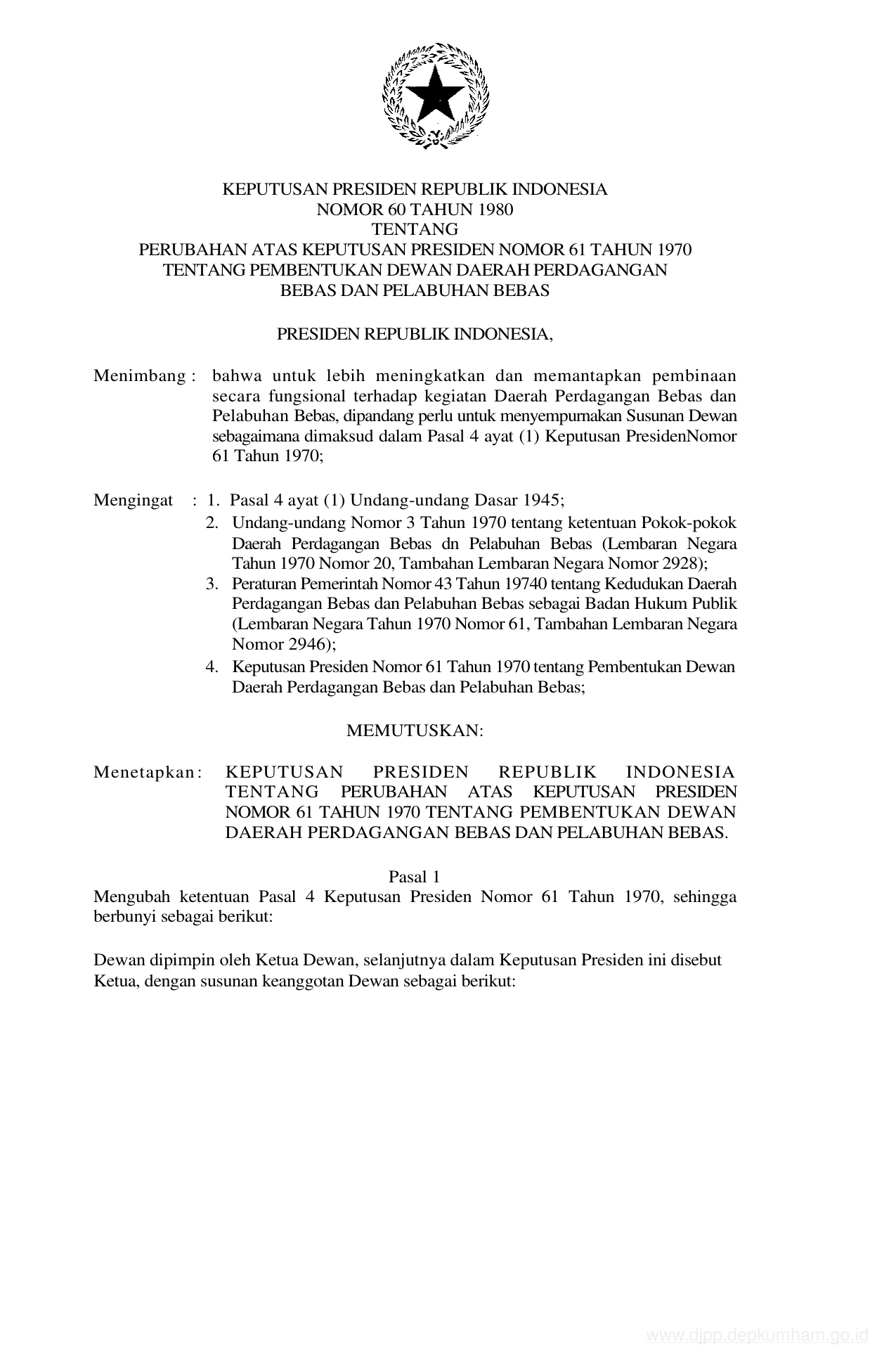 KEPPRES Nomor 60 Tahun 1980 | Keputusan Presiden Nomor 60 Tahun 1980 tentang PERUBAHAN ATAS KEPUTUSAN PRESIDEN NOMOR 61 TAHUN 1970 PEMBENTUKAN DEWAN DAERAH PERDAGANGAN BEBAS DAN PELABUHAN BEBAS