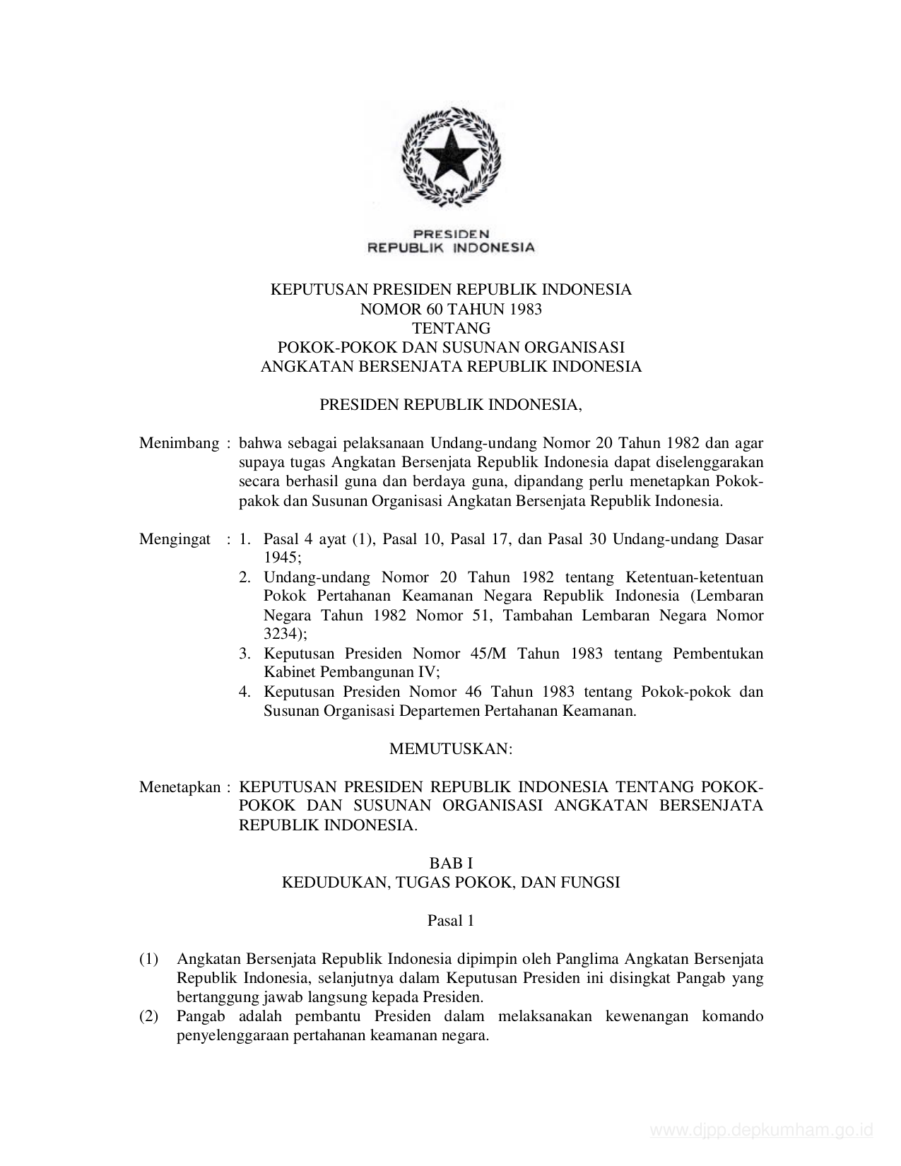 KEPPRES Nomor 60 Tahun 1983 | Keputusan Presiden Nomor 60 Tahun 1983 tentang POKOK- POKOK DAN SUSUNAN ORGANISASI ANGKATAN BERSENJATA REPUBLIK INDONESAI