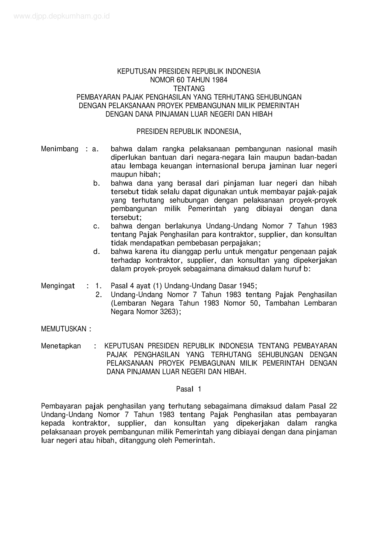 KEPPRES Nomor 60 Tahun 1984 | Keputusan Presiden Nomor 60 Tahun 1984 tentang PEMBAYARAN PAJAK PENGHASILAN YANG TERHUTANG SEHUBUNGAN DENGAN PELAKSANAAN PROYEK PEMBANGUNAN MILIK PEMERINTAH DENGAN DANA PINJAMAN LUAR NEGERI DAN HIBAH