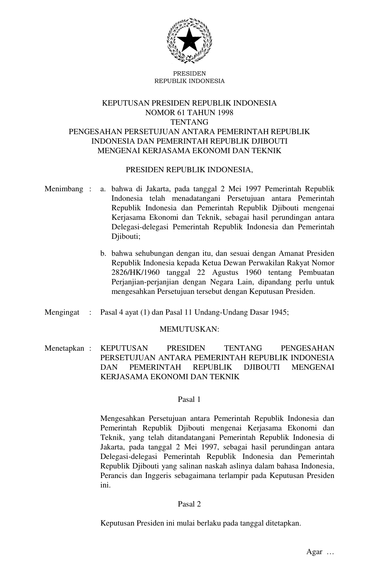 Mengesahkan Persetujuan antara Pemerintah Republik INDONESIA dan Pemerintah Republik Djibouti mengenai Kerjasama Ekonomi dan Teknik, yang telah ditandatangani Pemerintah Republik INDONESIA di Jakarta, pada tanggal 2 Mei 1997, sebagai hasil perundingan antara Delegasi-delegasi Pemerintah Republik INDONESIA dan Pemerintah Republik Djibouti yang salinan naskah aslinya dalam bahasa INDONESIA, Perancis dan Inggeris sebagaimana terlampir pada Keputusan PRESIDEN ini.