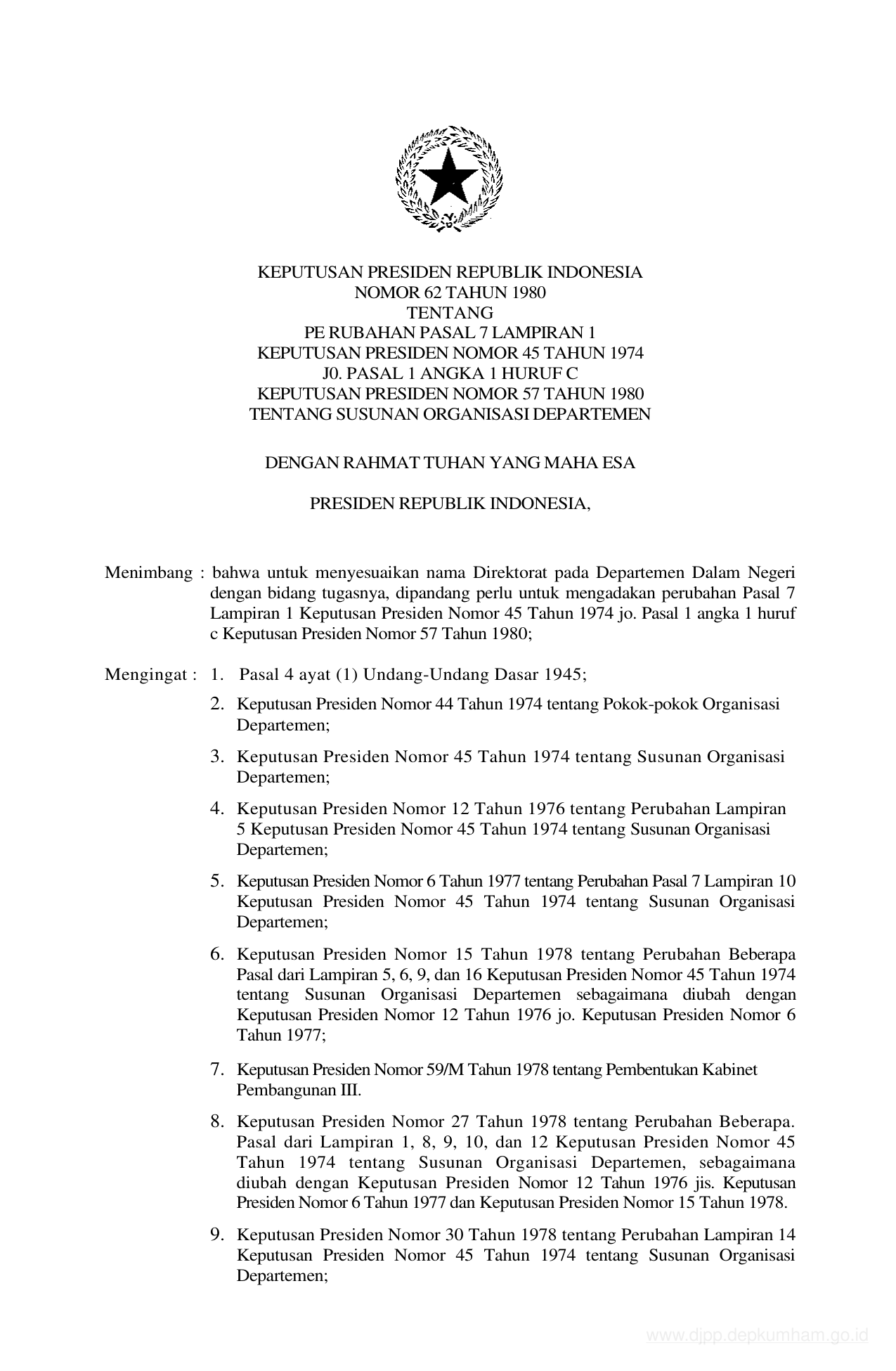KEPPRES Nomor 62 Tahun 1980 | Keputusan Presiden Nomor 62 Tahun 1980 tentang SUSUNAN ORGANISASI DEPARTEMEN