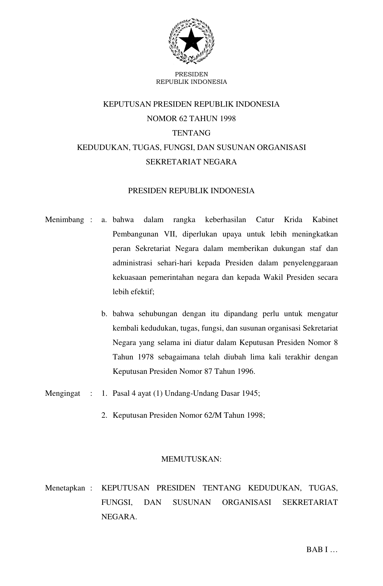 KEPPRES Nomor 62 Tahun 1998 | Keputusan Presiden Nomor 62 Tahun 1998 tentang KEDUDUKAN, TUGAS, FUNGSI, DAN SUSUNAN ORGANISASI SEKRETARIAT NEGARA