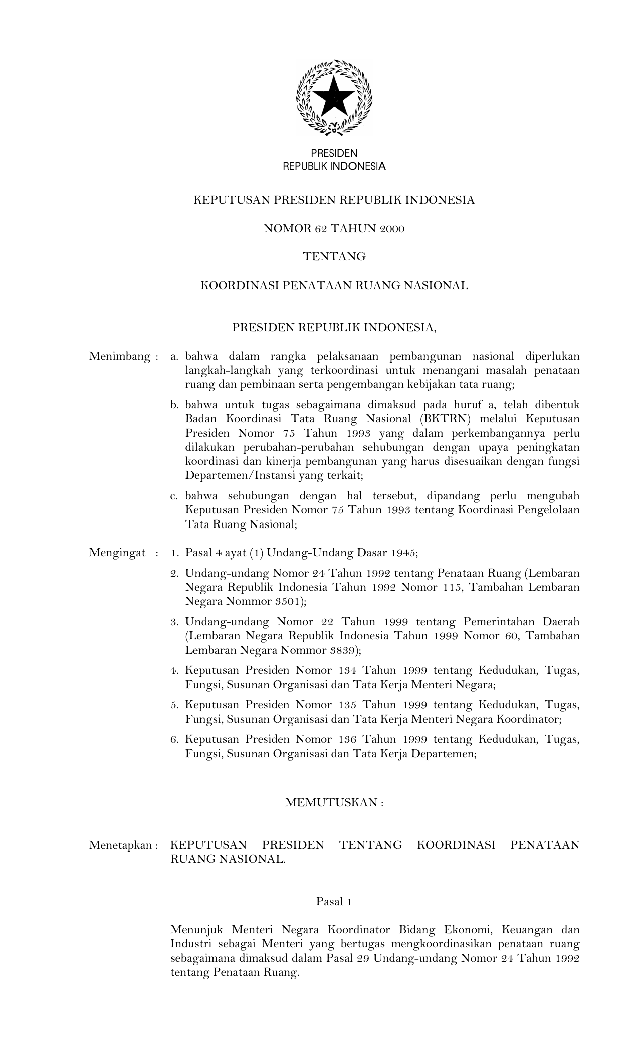 KEPPRES Nomor 62 Tahun 2000 | Keputusan Presiden Nomor 62 Tahun 2000 tentang KOORDINASI PENATAAN RUANG NASIONAL