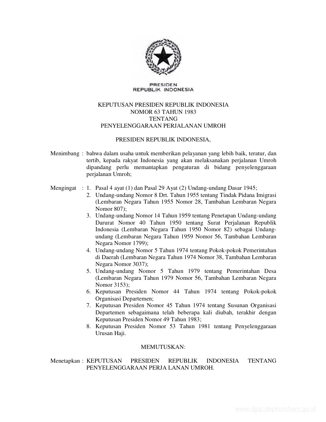 KEPPRES Nomor 63 Tahun 1983 | Keputusan Presiden Nomor 63 Tahun 1983 tentang PENYELENGGARAAN PERJALANAN UMROH