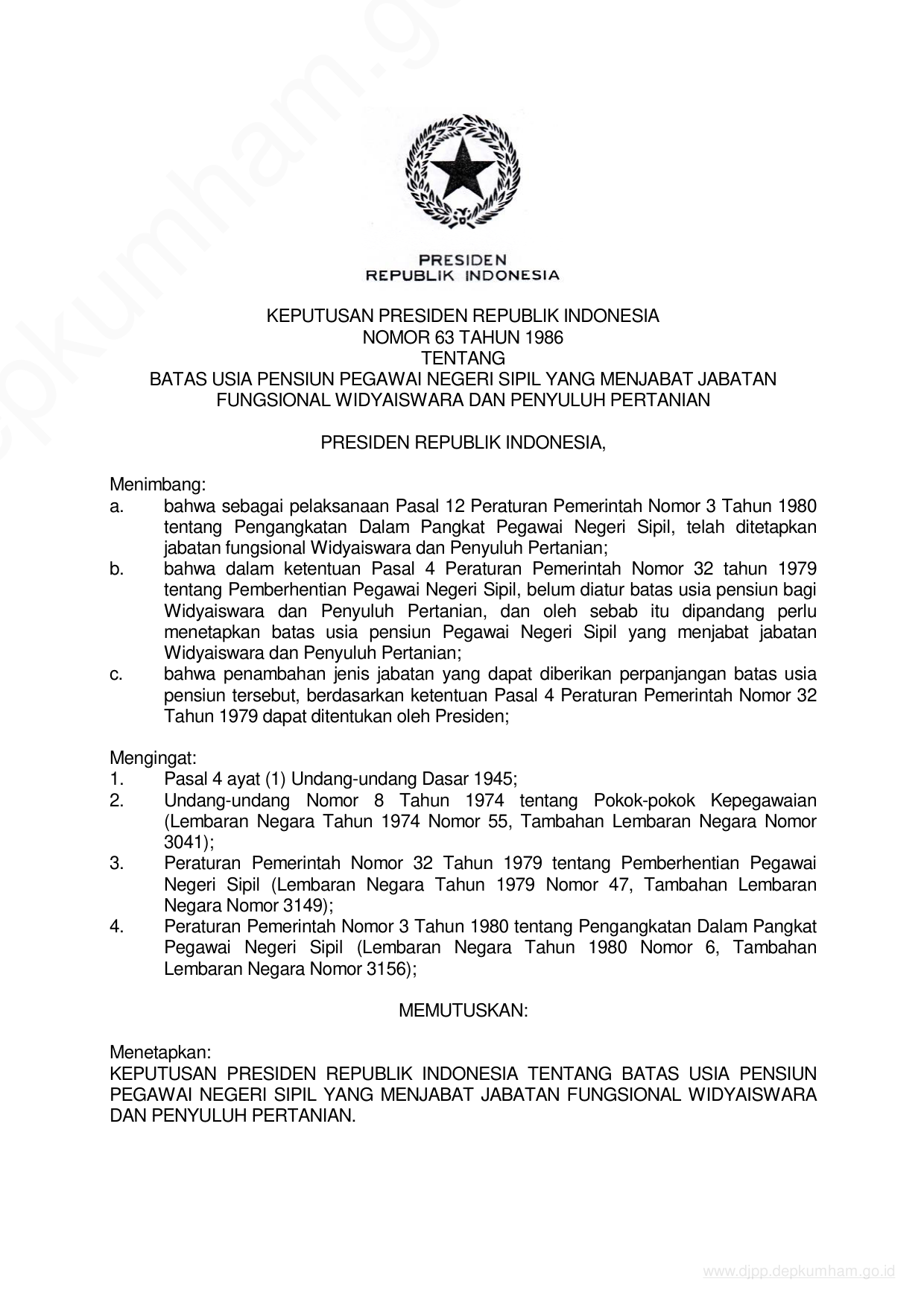 KEPPRES Nomor 63 Tahun 1986 | Keputusan Presiden Nomor 63 Tahun 1986 tentang BATAS USIA PENSIUN PEGAWAI NEGERI SIPIL YANG MENJABAT JABATAN FUNGSIONAL WIDYA ISWARA DAN PENYULUHAN PERTANIAN