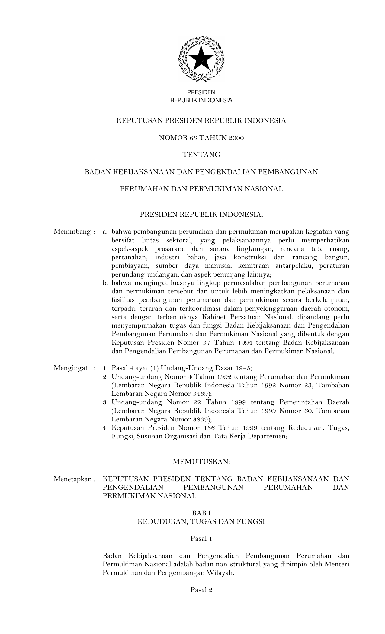 KEPPRES Nomor 63 Tahun 2000 | Keputusan Presiden Nomor 63 Tahun 2000 tentang BADAN KEBIJAKSANAAN DAN PENGENDALIAN PEMBANGUNAN PERUMAHAN DAN PERMUKIMAN NASIONAL