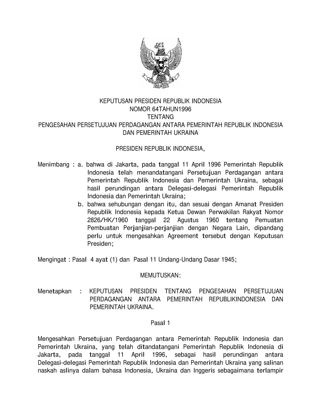 KEPPRES Nomor 64 Tahun 1996 | Keputusan Presiden Nomor 64 Tahun 1996 tentang PENGESAHAN PERSETUJUAN PERDAGANGAN ANTARA PEMERINTAH RI DAN PEMERINTAH UKRAINA