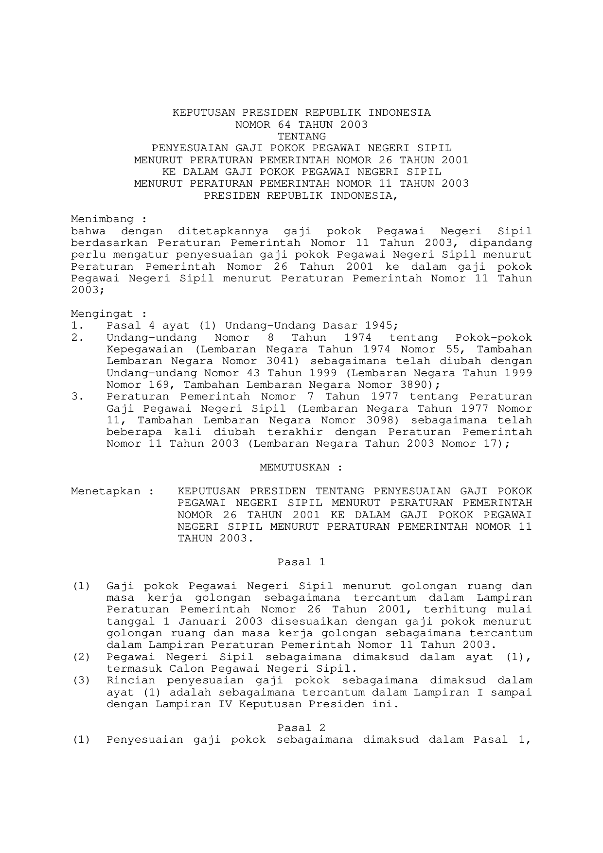 KEPPRES Nomor 64 Tahun 2003 | Keputusan Presiden Nomor 64 Tahun 2003 tentang PENYESUAIAN GAJI POKOK PEGAWAI NEGERI SIPIL MENURUT PP 26-2001 KE DALAM GAJI POKOK PEGAWAI NEGERI SIPIL MENURUT PP 11-2003
