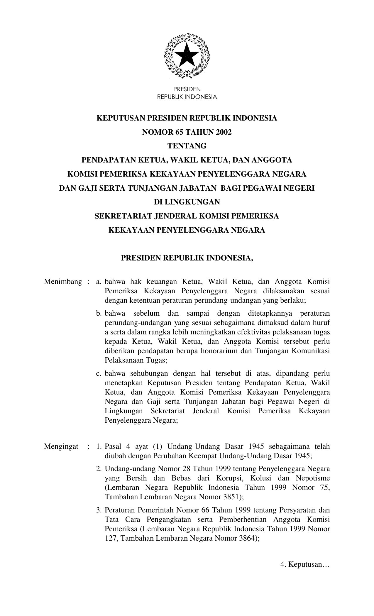 KEPPRES Nomor 65 Tahun 2002 | Keputusan Presiden Nomor 65 Tahun 2002 tentang PENDAPATAN KETUA, WAKIL KETUA, DAN ANGGOTA KOMISI PEMERIKSA KEKAYAAN PENYELENGGARA NEGARA DAN GAJI SERTA TUNJANGAN JABATAN BAGI PEGAWAI NEGERI DI LINGKUNGAN SEKRETARIAT JENDERAL KOMISI PEMERIKSA KEKAYAAN PENYELENGGARA NEGARA