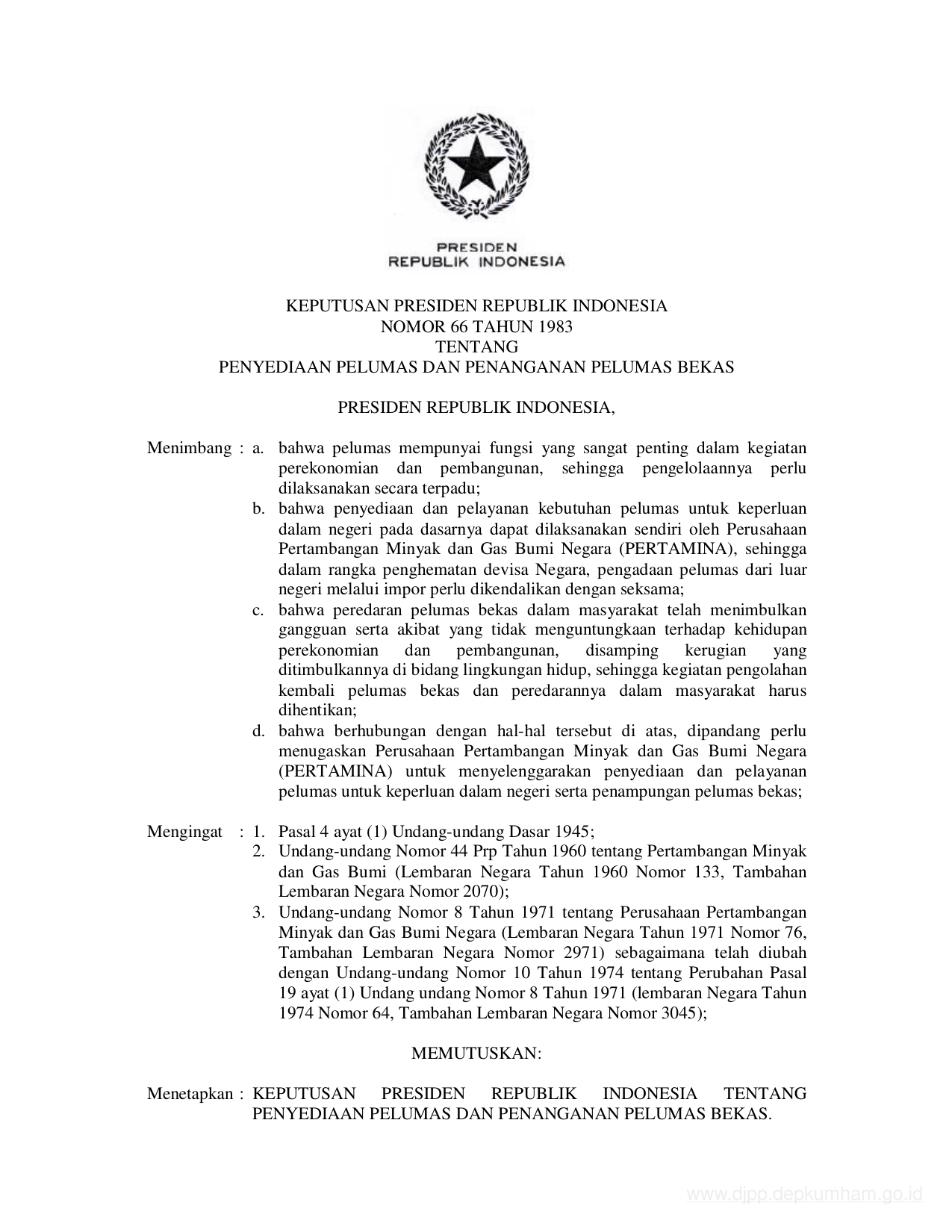 KEPPRES Nomor 66 Tahun 1983 | Keputusan Presiden Nomor 66 Tahun 1983 tentang PENYEDIAAN PELUMAS DAN PENANGANAN PELUMAS BEKAS