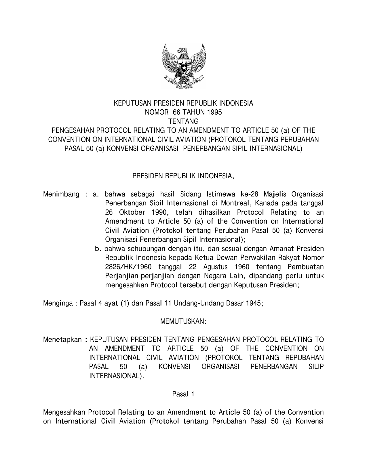 KEPPRES Nomor 66 Tahun 1995 | Keputusan Presiden Nomor 66 Tahun 1995 tentang PENGESAHAN PROTOCOL RELATING TO AND AMENDMENT TO ARTICLE 50 (A) OF THE CONVENTION ON INTERNATIONAL CIVIL AVIATION (PROTOKOL TENTANG PERUBAHAN PASAL 50 (A) KONVENSI ORGANISASI PENERBANGAN SIPIL INTERNASIONAL