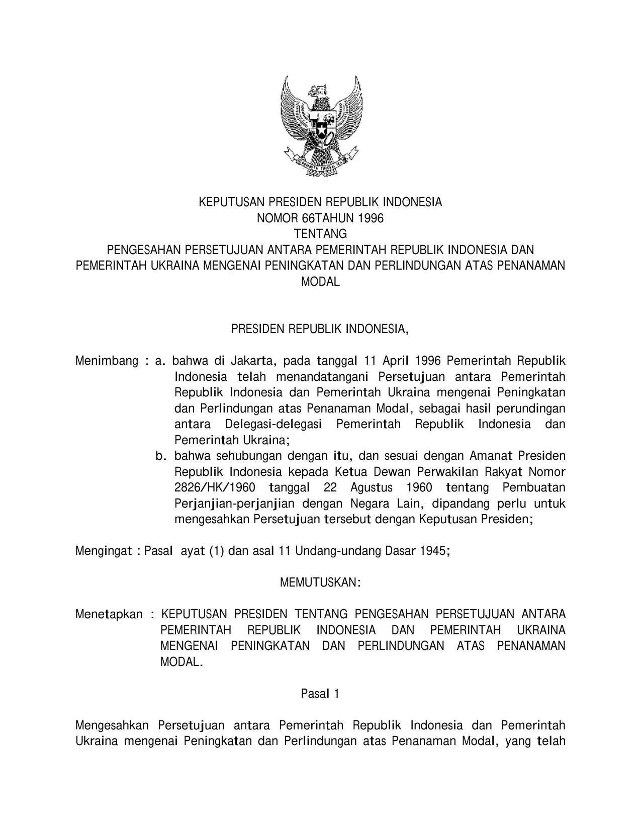 KEPPRES Nomor 66 Tahun 1996 | Keputusan Presiden Nomor 66 Tahun 1996 tentang PENGESAHAN PERSETUJUAN ANTARA PEMERINTAH RI DAN PEMERINTAH UKRAINA MENGENAI PENINGKATAN DAN PERLINDUNGAN ATAS PENANAMAN MODAL
