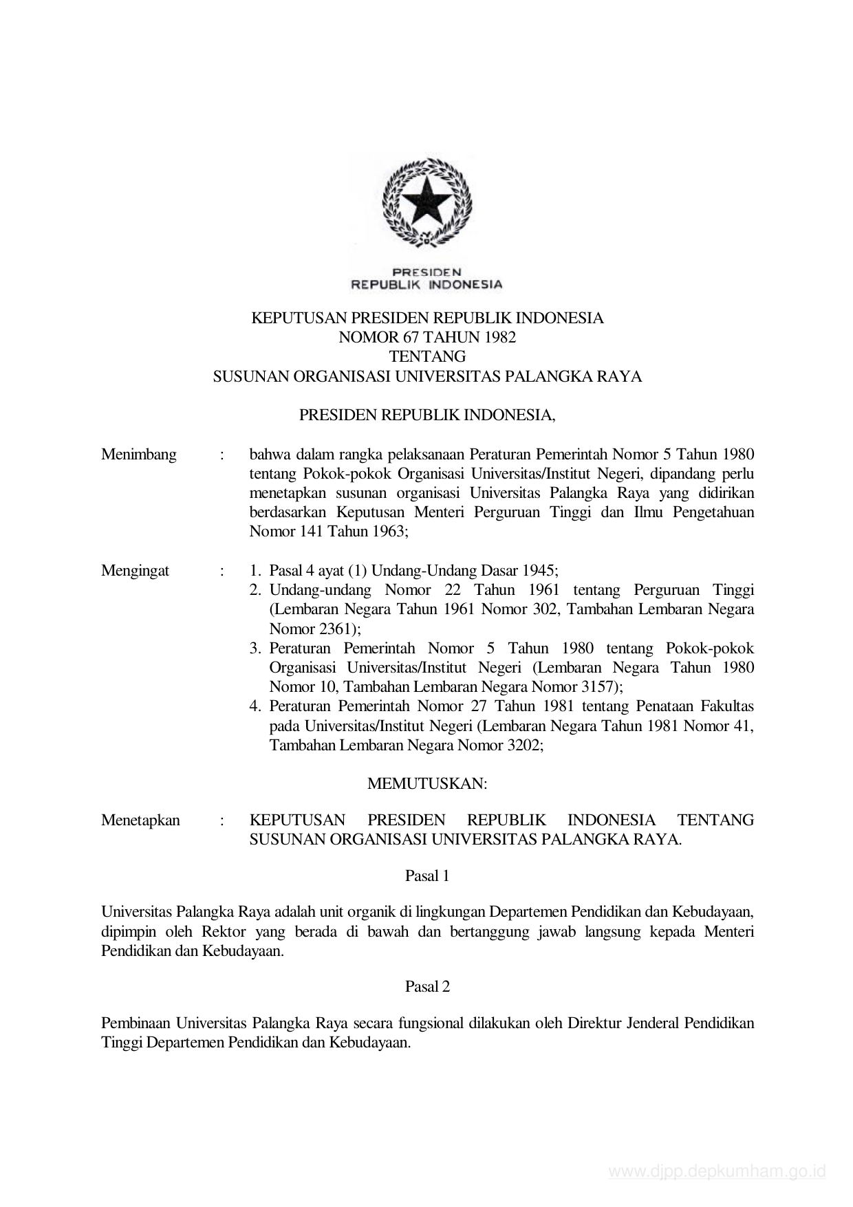 KEPPRES Nomor 67 Tahun 1982 | Keputusan Presiden Nomor 67 Tahun 1982 tentang SUSUNAN ORGANISASI UNIVERSITAS PALANGKARAYA