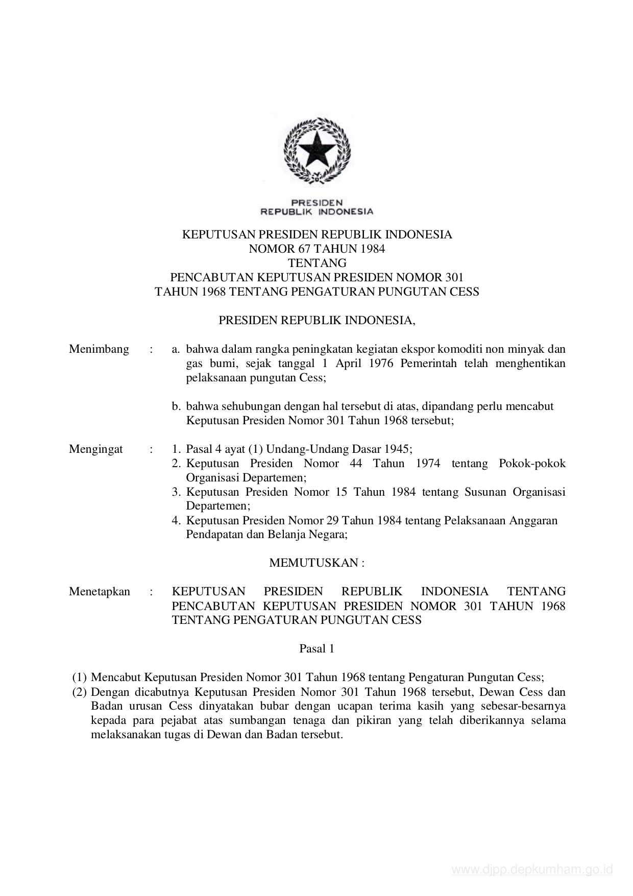 KEPPRES Nomor 67 Tahun 1984 | Keputusan Presiden Nomor 67 Tahun 1984 tentang PENCABUTAN KEPUTUSAN PRESIDEN NOMOR 301 TAHUN 1968 TENTANG PENGATURAN PUNGUTAN CESS