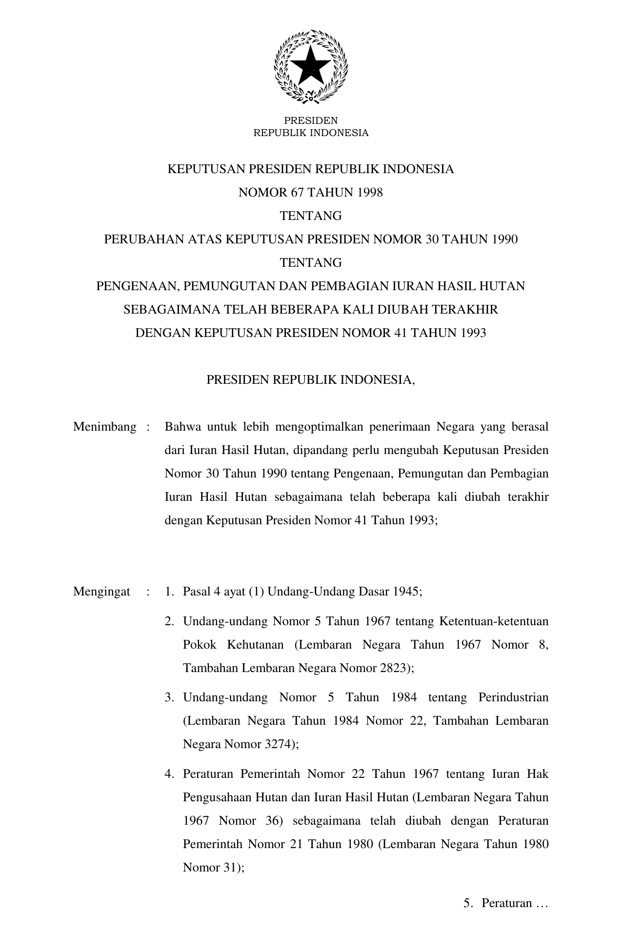 KEPPRES Nomor 67 Tahun 1998 | Keputusan Presiden Nomor 67 Tahun 1998 tentang PERUBAHAN ATAS KEPUTUSAN PRESIDEN NOMOR 30 TAHUN 1990 TENTANG PENGENAAN, PEMUNGUTAN DAN PEMBAGIAN IURAN HASIL HUTAN SEBAGAIMANA TELAH BEBERAPA KALI DIUBAH TERAKHIR DENGAN KEPUTUSAN PRESIDEN NOMOR 41 TAHUN 1993