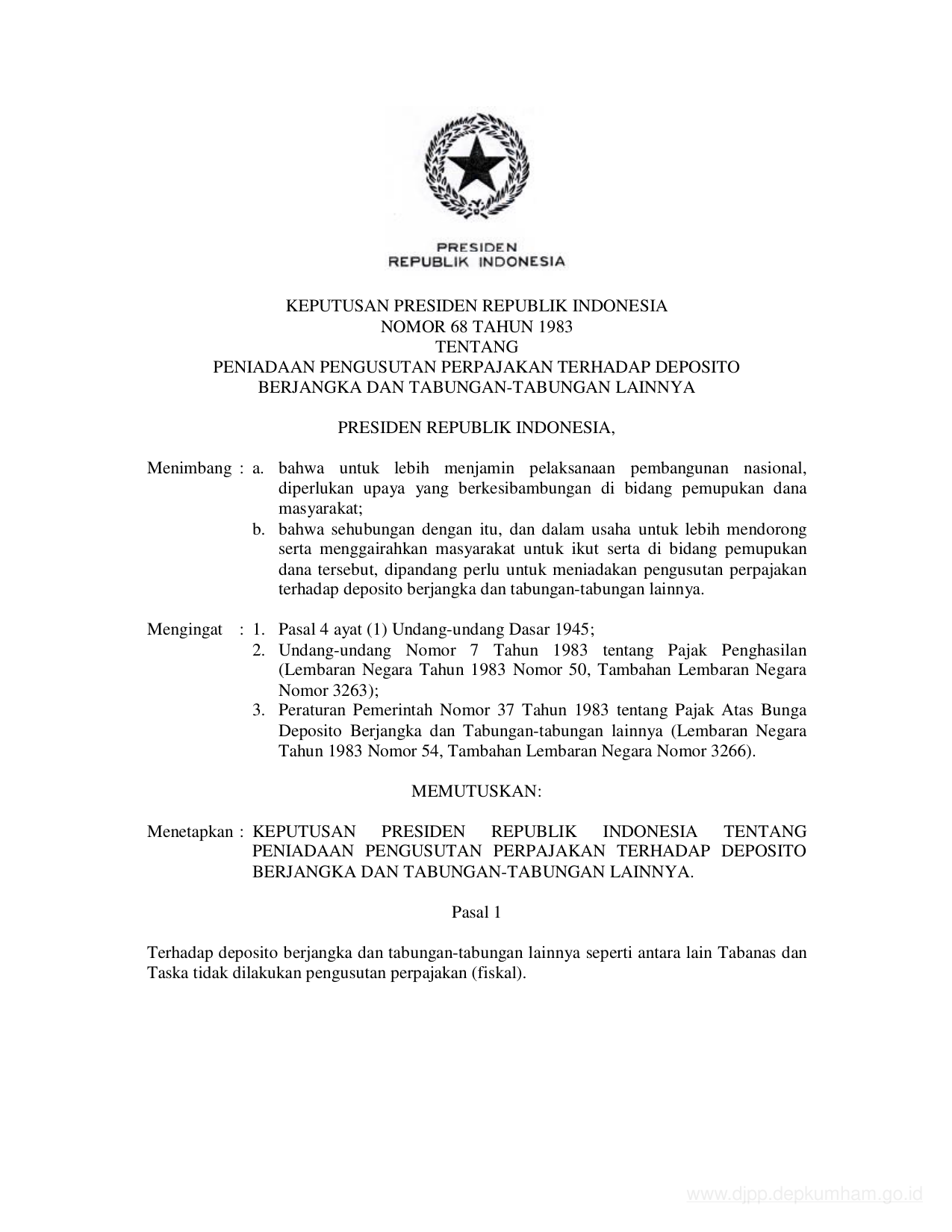 KEPPRES Nomor 68 Tahun 1983 | Keputusan Presiden Nomor 68 Tahun 1983 tentang PENIADAAN PENGUSUTAN PERPAJAKAN TERHADAP DEPOSITO BERJANGKA DAN TABUNGAN- TABUNGAN LAINNYA