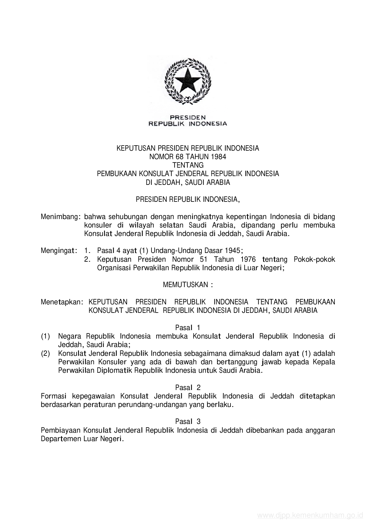 KEPPRES Nomor 68 Tahun 1984 | Keputusan Presiden Nomor 68 Tahun 1984 tentang PEMBUKAAN KONSULAT JENDERAL REPUBLIK INDONESIA DI JEDDAH, SAUDI ARABIA