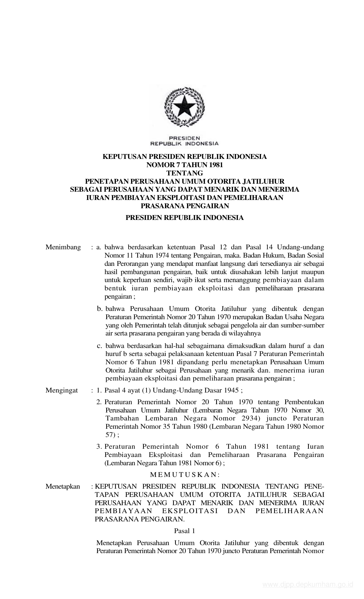 KEPPRES Nomor 7 Tahun 1981 | Keputusan Presiden Nomor 7 Tahun 1981 tentang PENETAPAN PERUSAHAAN UMUM(PERUM) "OTORITA JATILUHUR" SEBAGAI PERUSAHAAN YANG DAPAT MENARIK DAN MENERIMA IURAN PEMBIAYAAN EKSPLOITASI DAN PEMELIHARAAN PERSARANA PENGAIRAN