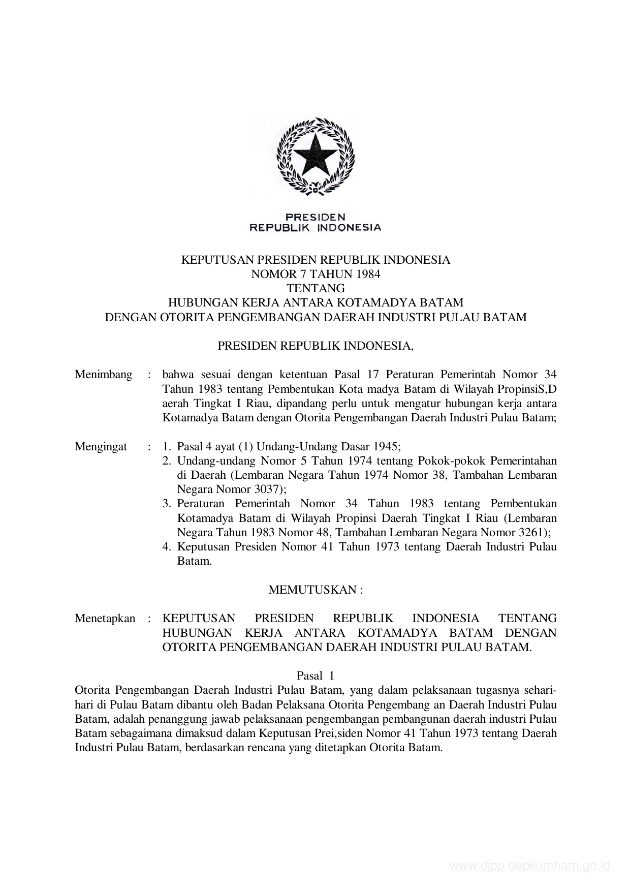 KEPPRES Nomor 7 Tahun 1984 | Keputusan Presiden Nomor 7 Tahun 1984 tentang HUBUNGAN KERJA ANTARA KOTAMADYA BATAM DENGAN OTORITA PENGEMBANGAN DAERAH INDUSTRI PULAU BATAM