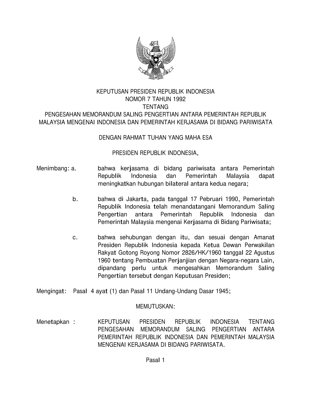 KEPUTUSAN PRESIDEN REPUBLIK INDONESIA NOMOR 7 TAHUN 1992 TENTANG PENGESAHAN MEMORANDUM SALING PENGERTIAN ANTARA PEMERINTAH REPUBLIK MALAYSIA MENGENAI INDONESIA DAN PEMERINTAH KERJASAMA DI BIDANG PARIWISATA