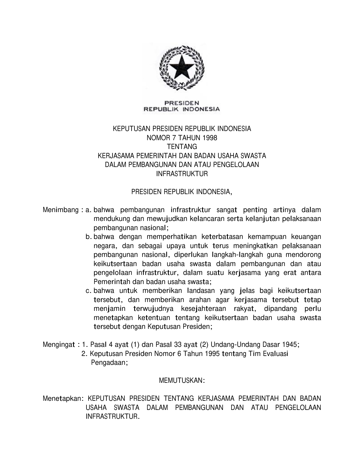 KEPPRES Nomor 7 Tahun 1998 | Keputusan Presiden Nomor 7 Tahun 1998 tentang KERJASAMA PEMERINTAH DAN BADAN USAHA SWASTA DALAM PEMBANGUNAN DAN ATAU PENGELOLAAN INFRASTRUKTUR