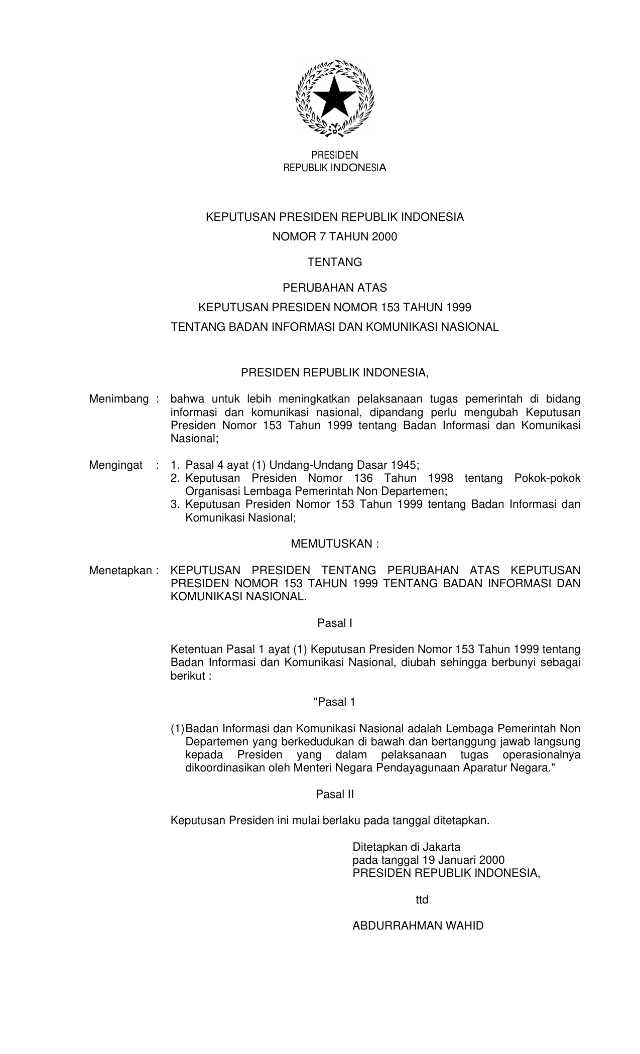 KEPPRES Nomor 7 Tahun 2000 | Keputusan Presiden Nomor 7 Tahun 2000 tentang PERUBAHAN KEPPRES 153-1999 TENTANG BADAN INFORMASI DAN KOMUNIKASI NASIONAL