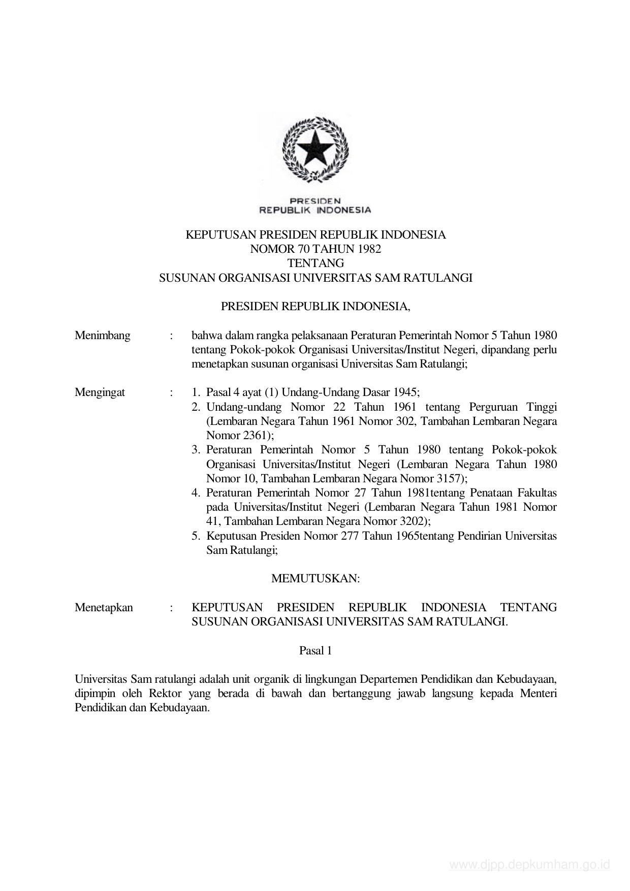 KEPPRES Nomor 70 Tahun 1982 | Keputusan Presiden Nomor 70 Tahun 1982 tentang SUSUNAN ORGANISASI UNIVERSITAS SAM RATU LANGI