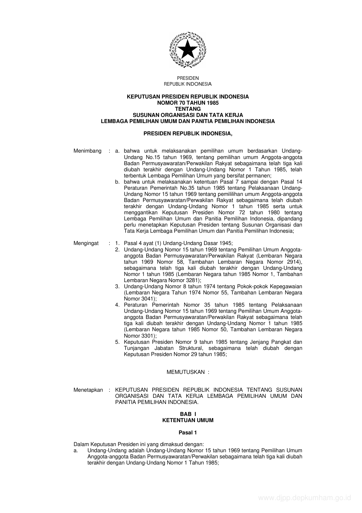 KEPPRES Nomor 70 Tahun 1985 | Keputusan Presiden Nomor 70 Tahun 1985 tentang SUSUNAN ORGANISASI DAN TATA KERJA LEMBAGA PEMILIHAN UMUM DAN PANITIA PEMILIHAN INDONESIA