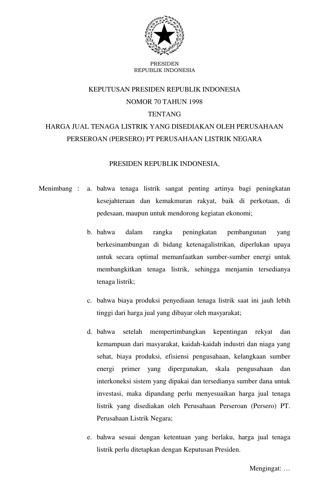 KEPPRES Nomor 70 Tahun 1998 | Keputusan Presiden Nomor 70 Tahun 1998 tentang HARGA JUAL TENAGA LISTRIK YANG DISEDIAKAN OLEH PERUSAHAAN PERSEROAN (PERSERO) PT PERUSAHAAN LISTRIK NEGARA