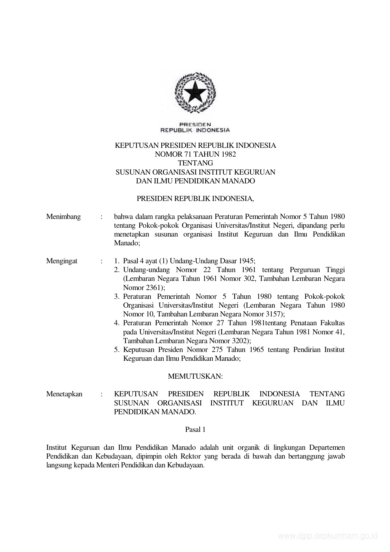 KEPPRES Nomor 71 Tahun 1982 | Keputusan Presiden Nomor 71 Tahun 1982 tentang SUSUNAN ORGANISASI INSTITUT KEGURUAN DAN ILMU PENDIDIKAN MANADO