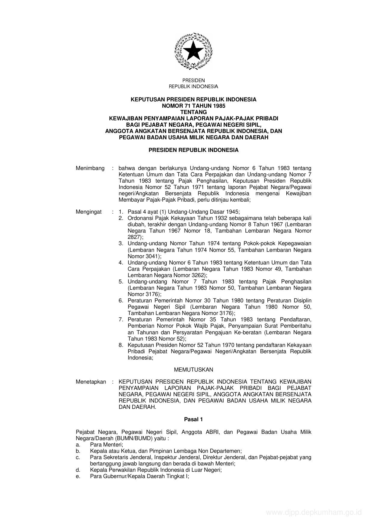 KEPPRES Nomor 71 Tahun 1985 | Keputusan Presiden Nomor 71 Tahun 1985 tentang KEWAJIBAN PENYAMPAIAN LAPORAN PAJAK-PAJAK PRIBADI BAGI PEJABAT NEGARA, PEGAWAI NEGERI SIPIL, ANGGOTA ANGKATAN BERSENJATA REPUBLIK INDONESIA DAN PEGAWAI BADAN USAHA MILIK NEGARA DAN DAERAH