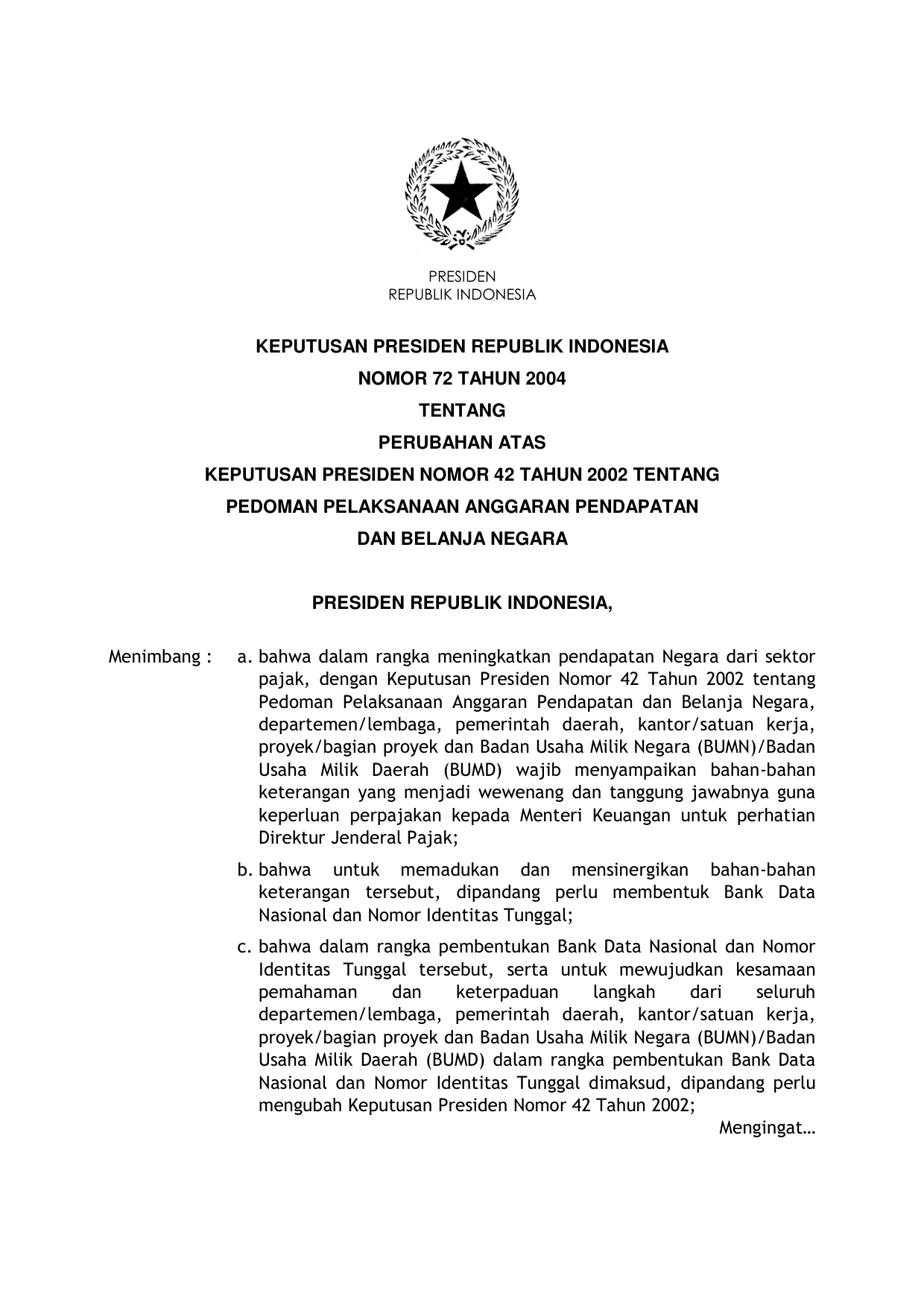 KEPPRES Nomor 72 Tahun 2004 | Keputusan Presiden Nomor 72 Tahun 2004 tentang PERUBAHAN KEPPRES 42-2002 TENTANG PEDOMAN PELAKSANAAN ANGGARAN PENDAPATAN DAN BELANJA NEGARA