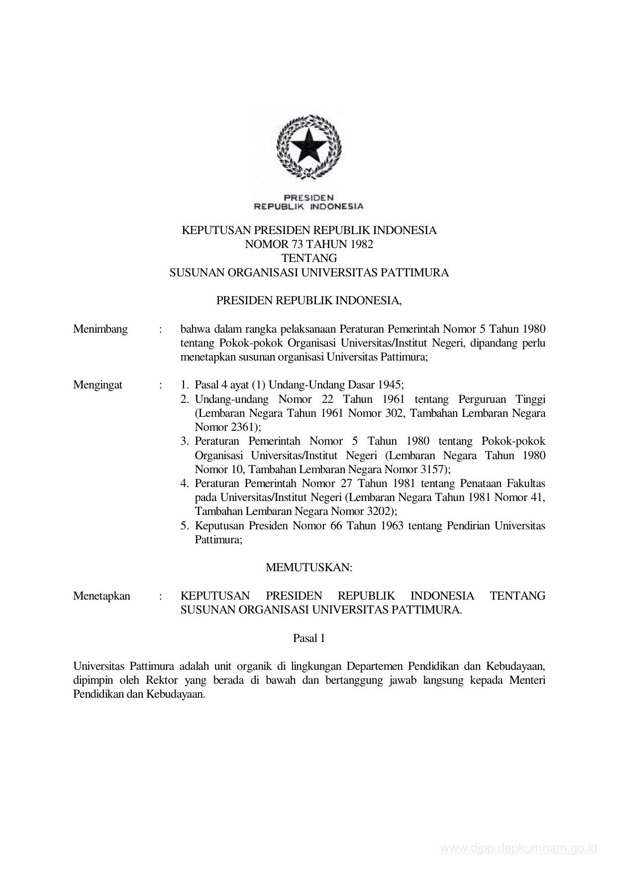 KEPPRES Nomor 73 Tahun 1982 | Keputusan Presiden Nomor 73 Tahun 1982 tentang SUSUNAN ORGANISASI UNIVERSITAS PATTIMURA