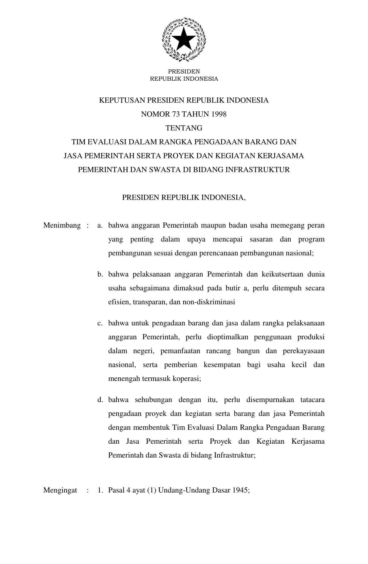 KEPPRES Nomor 73 Tahun 1998 | Keputusan Presiden Nomor 73 Tahun 1998 tentang TIM EVALUASI DALAM RANGKA PENGADAAN BARANG DAN JASA PEMERINTAH SERTA PROYEK DAN KEGIATAN KERJASAMA PEMERINTAH DAN SWASTA DI BIDANG INFRASTRUKTUR