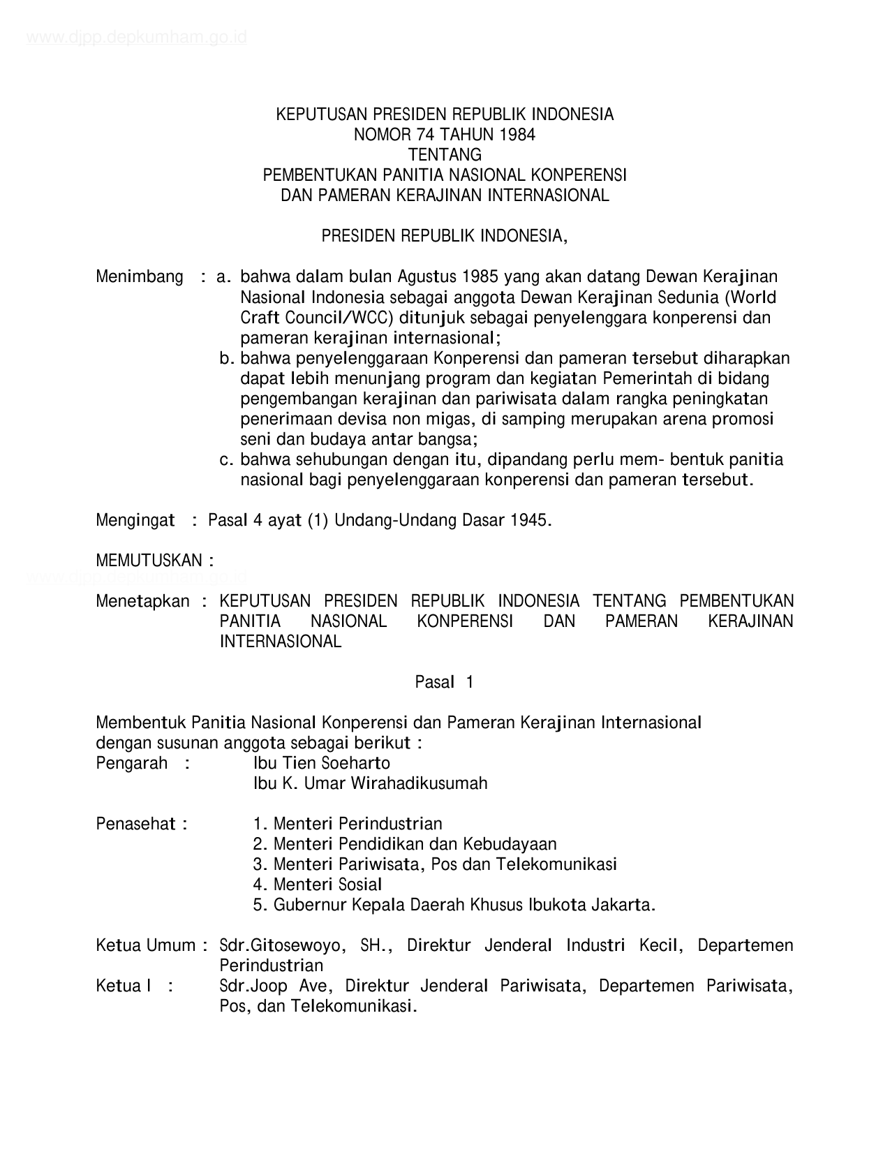 KEPPRES Nomor 74 Tahun 1984 | Keputusan Presiden Nomor 74 Tahun 1984 tentang PEMBENTUKAN PANITIA NASIONAL KONPERENSI DAN PAMERAN KERAJINAN INTERNASIONAL