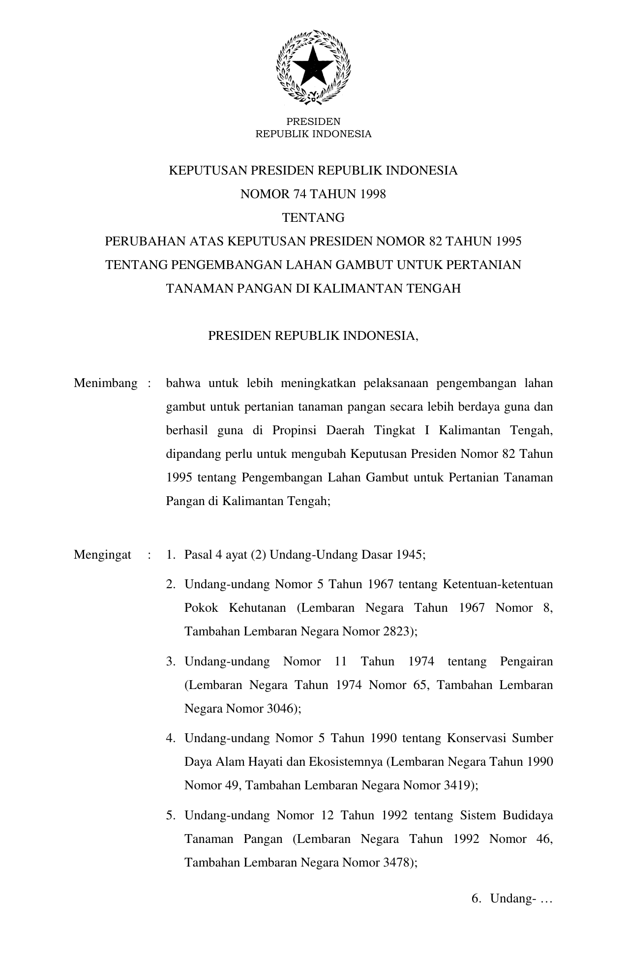 KEPPRES Nomor 74 Tahun 1998 | Keputusan Presiden Nomor 74 Tahun 1998 tentang PERUBAHAN ATAS KEPUTUSAN PRESIDEN NOMOR 82 TAHUN 1995 TENTANG PENGEMBANGAN LAHAN GAMBUT UNTUK PERTANIAN TANAMAN PANGAN DI KALIMANTAN TENGAH