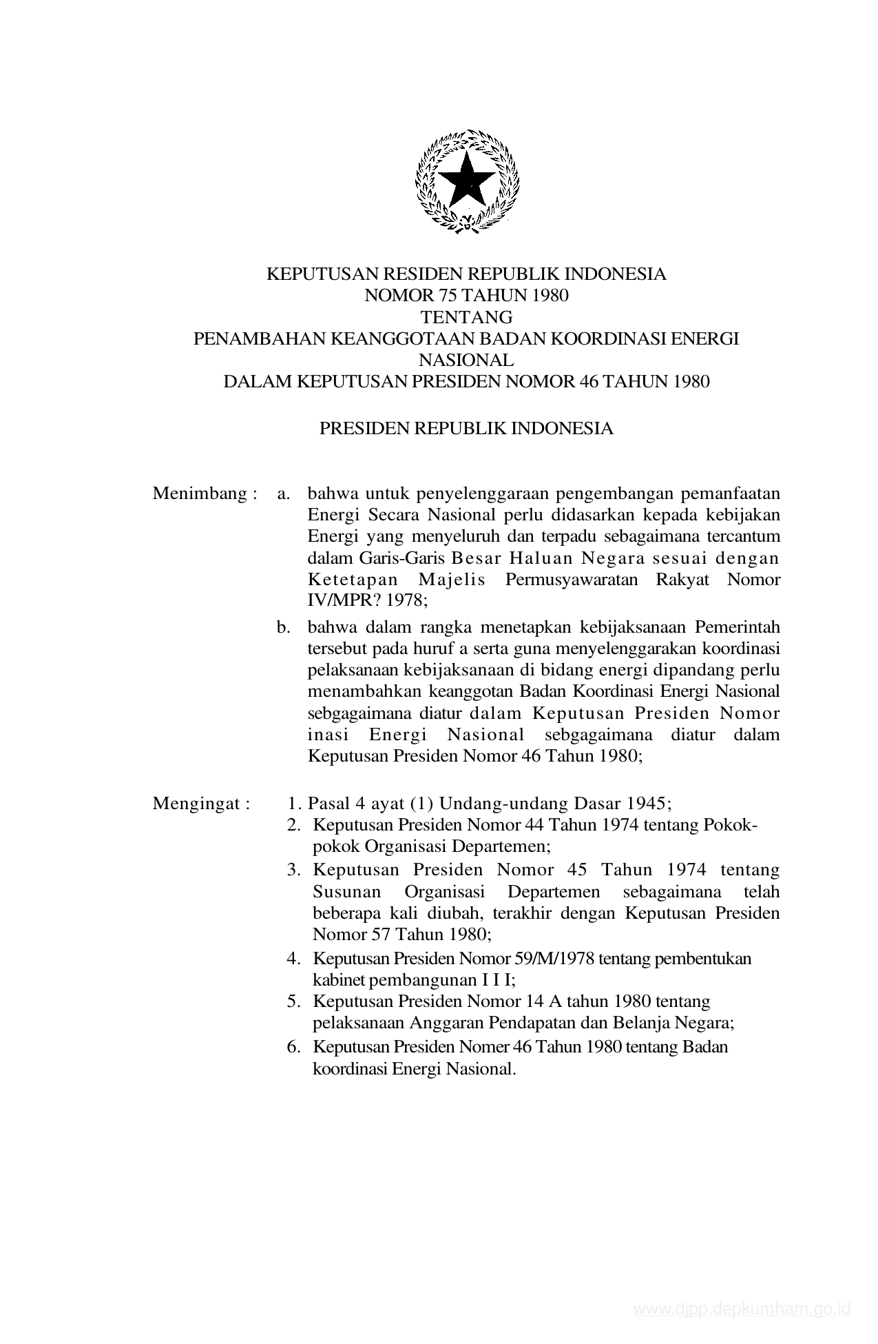 KEPPRES Nomor 75 Tahun 1980 | Keputusan Presiden Nomor 75 Tahun 1980 tentang PENAMBAHAN KENGGOTAAN BADAN KOORDINASI ENERGI NASIONAL DALAM KEPUTUSAN PRESIDEN NOMOR 46 TAHUN 1980