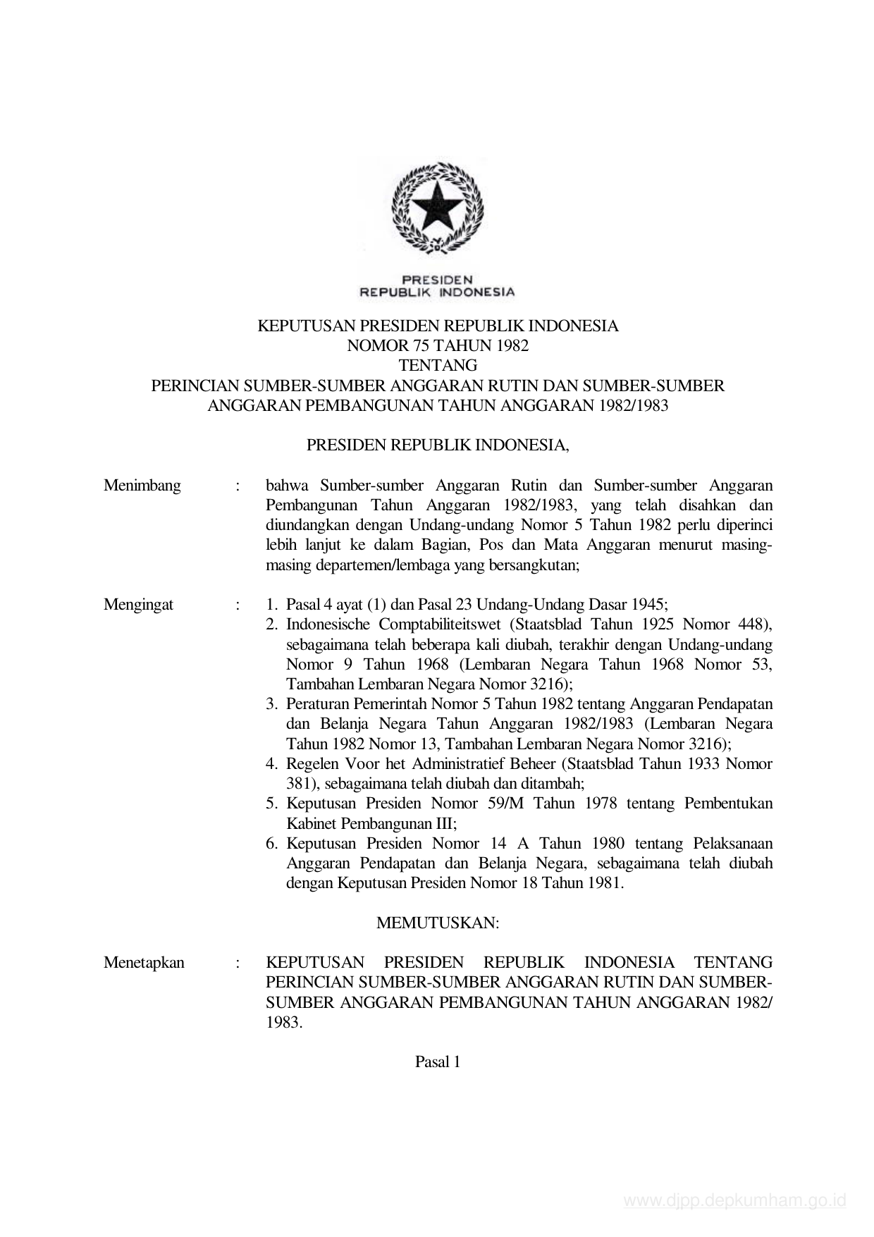 KEPPRES Nomor 75 Tahun 1982 | Keputusan Presiden Nomor 75 Tahun 1982 tentang PERINCIAN SUMBER-SUMBER ANGGARAN RUTIN DAN SUMBER-SUMBER ANGGARAN PEMBANGUNAN TAHUN ANGGARAN 1982/1983