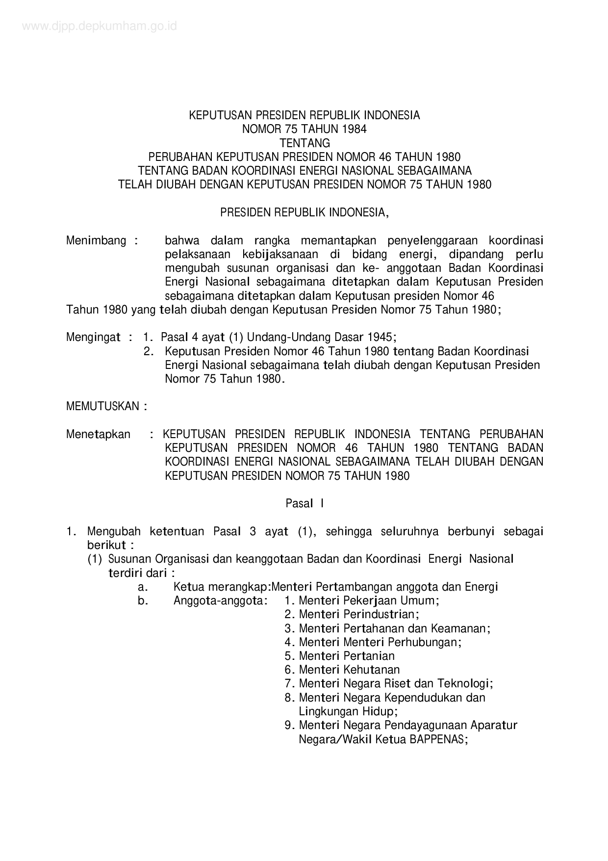 KEPPRES Nomor 75 Tahun 1984 | Keputusan Presiden Nomor 75 Tahun 1984 tentang PERUBAHAN KEPUTUSAN PRESIDEN NOMOR 46 TAHUN 1980 TENTANG BADAN KOORDINASI ENERGI NASIONAL SEBAGAIMANA TELAH DIUBAH DENGAN KEPUTUSAN PRESIDEN NOMOR 75 TAHUN 1980