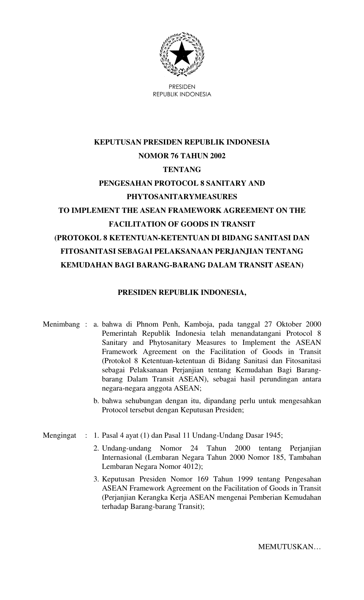 KEPPRES Nomor 76 Tahun 2002 | Keputusan Presiden Nomor 76 Tahun 2002 tentang PENGESAHAN PROTOCOL 8 SANITARY AND PHYTOSANITARY MEASURES TO IMPLEMENT THE ASEAN FRAMEWORK AGREEMENT ON THE FACILITATION OF GOODS IN TRANSIT (PROTOKOL 8 KETENTUAN-KETENTUAN DI BIDANG SANITASI DAN FITOSANITASI SEBAGAI PELAKSANAAN PERJANJIAN TENTANG KEMUDAHAN BAGI BARANG-BARANG DALAM TRANSIT ASEAN)