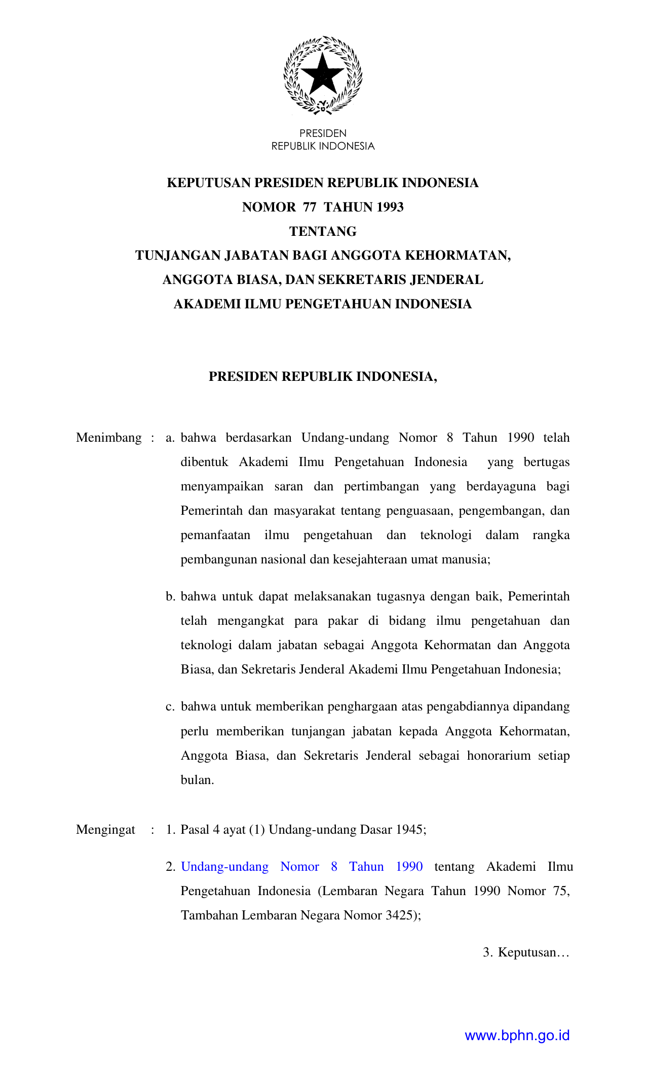 KEPPRES Nomor 77 Tahun 1993 | Keputusan Presiden Nomor 77 Tahun 1993 tentang TUNJANGAN JABATAN BAGI ANGGOTA KEHORMATAN, ANGGOTA BIASA, DAN SEKRETARIS JENDERAL AKADEMI ILMU PENGETAHUAN INDONESIA