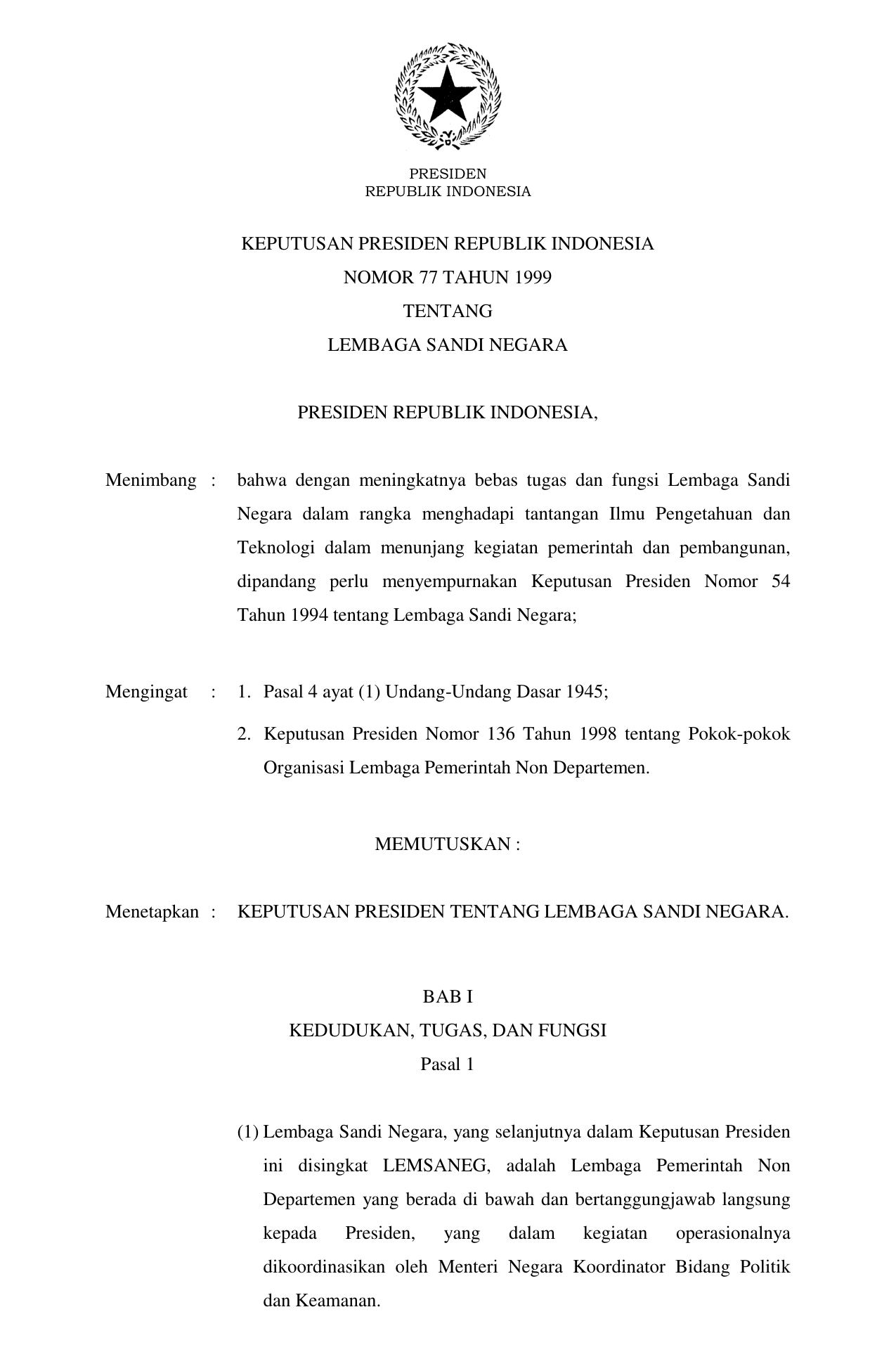 KEPPRES Nomor 77 Tahun 1999 | Keputusan Presiden Nomor 77 Tahun 1999 tentang LEMBAGA SANDI NEGARA