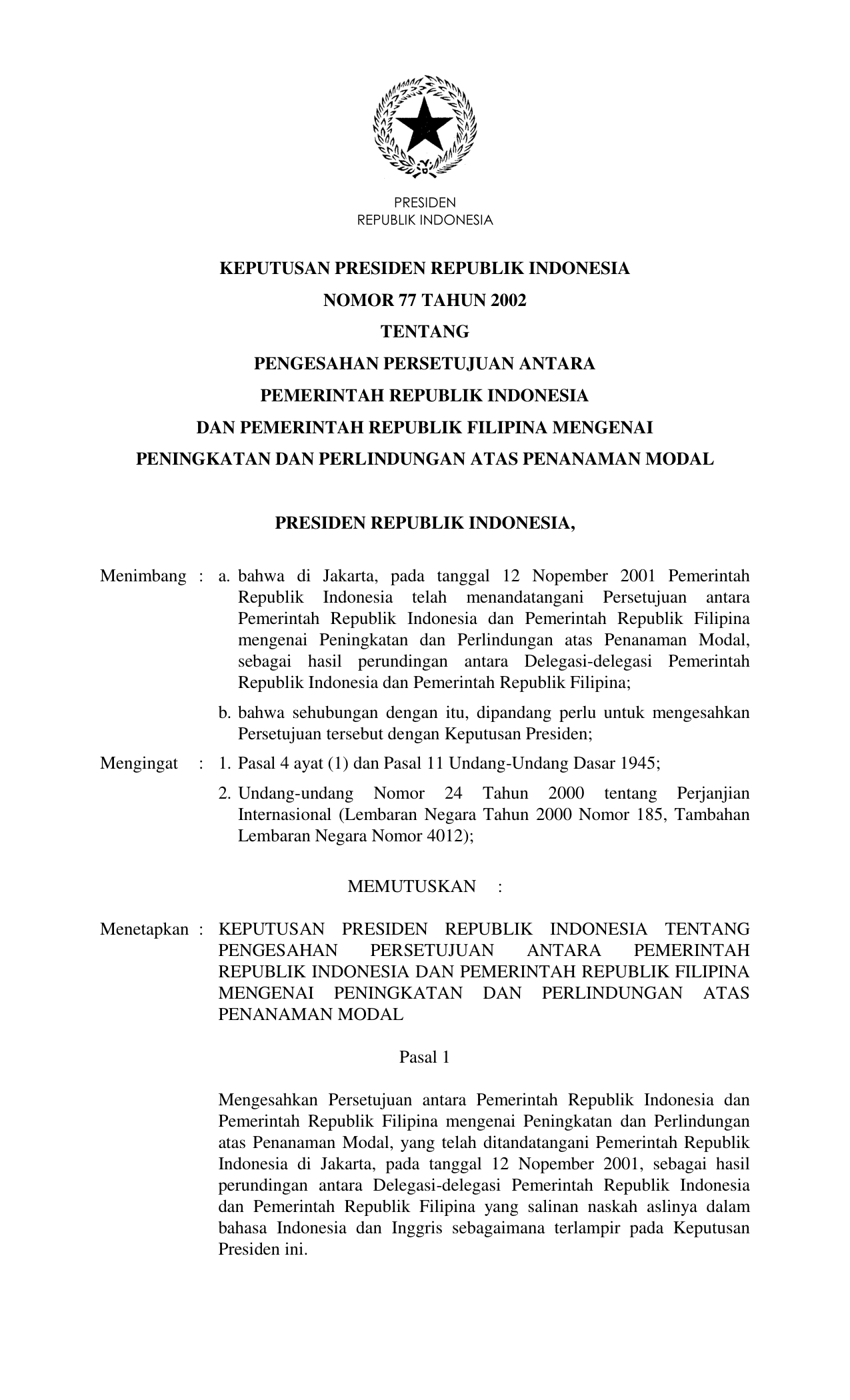 KEPPRES Nomor 77 Tahun 2002 | Keputusan Presiden Nomor 77 Tahun 2002 tentang PENGESAHAN PERSETUJUAN ANTARA PEMERINTAH RI DAN PEMERINTAH REPUBLIK PHILIPINA MENGENAI PENINGKATAN DAN PERLINDUNGAN ATAS PENANAMAN MODAL