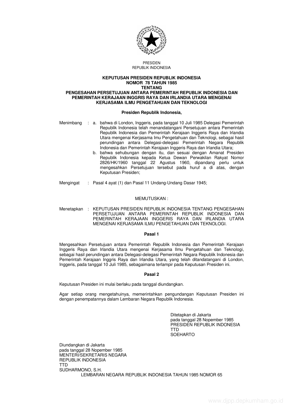 KEPPRES Nomor 78 Tahun 1985 | Keputusan Presiden Nomor 78 Tahun 1985 tentang PENGESAHAN PERSETUJUAN ANTARA PEMERINTAH RI DAN PEMERINTAH KERAJAAN INGGRIS RAYA DAN IRLANDIA UTARA MENGENAI KERJASAMA ILMU PENGETAHUAN DAN TEKNOLOGI