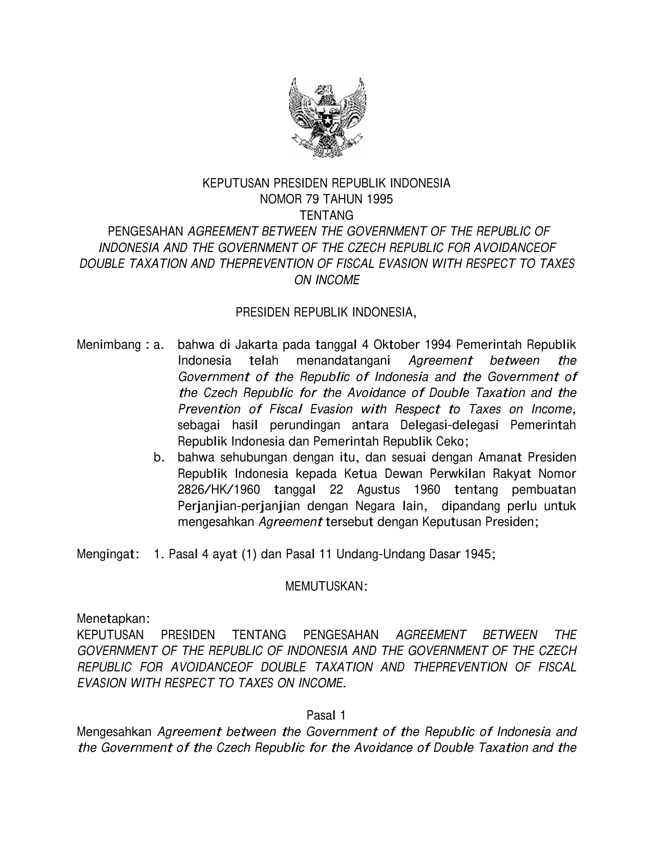KEPPRES Nomor 79 Tahun 1995 | Keputusan Presiden Nomor 79 Tahun 1995 tentang PENGESAHAN AGREEMENT BETWEEN THE GOVERNMENT OF THE REPUBLIC OF INDONESIA AND THE GOVERNMENT OF THE CZECH REPUBLIC FOR THE AVOIDANCE OF DOUBLE TAXATION AND THE PREVENTION OF FISCAL EVASION WITH RESPECT TO TAXES ON INCOME
