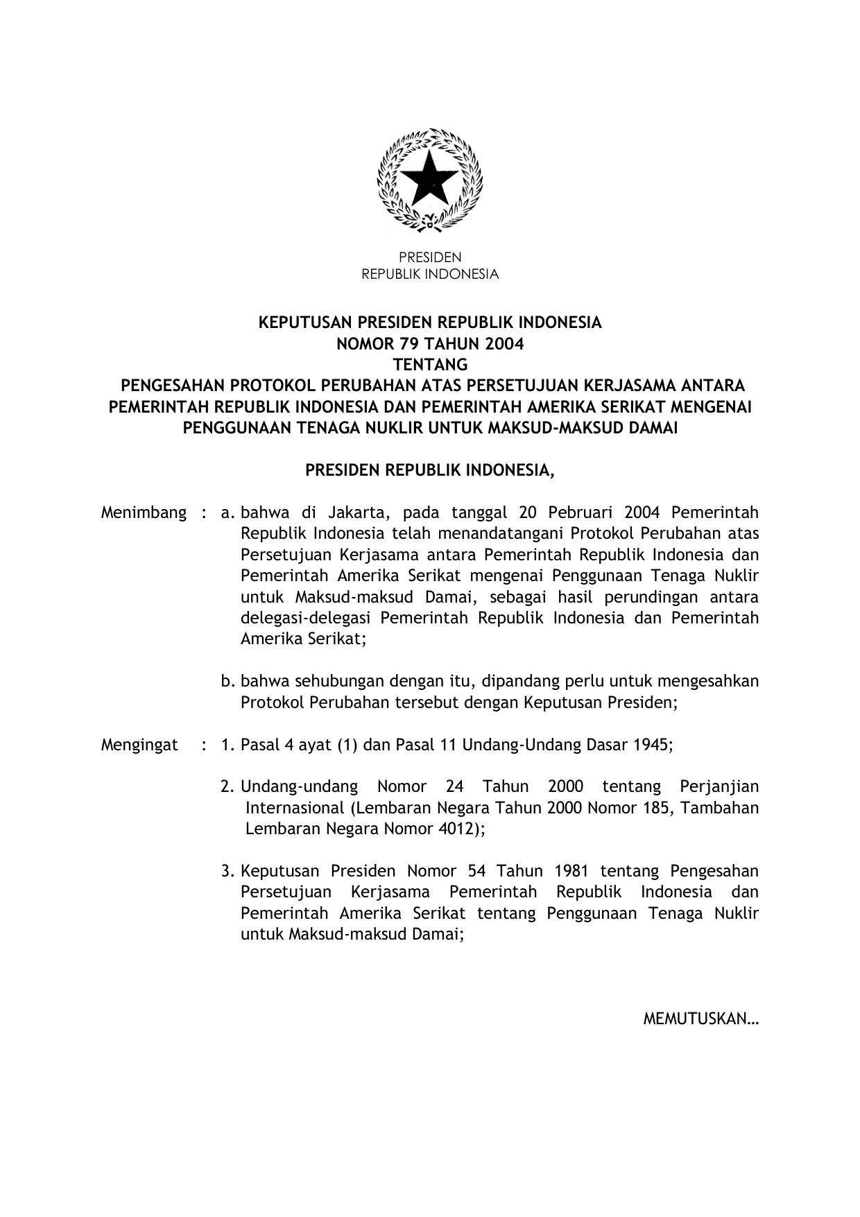 KEPPRES Nomor 79 Tahun 2004 | Keputusan Presiden Nomor 79 Tahun 2004 tentang PENGESAHAN PROTOKOL PERUBAHAN ATAS PERSETUJUAN KERJASAMA ANTARA PEMERINTAH RI DAN PEMERINTAH AMERIKA SERIKAT MENGENAI PENGGUNAAN TENAGA NUKLIR UNTUK MAKSUD-MAKSUD DAMAI