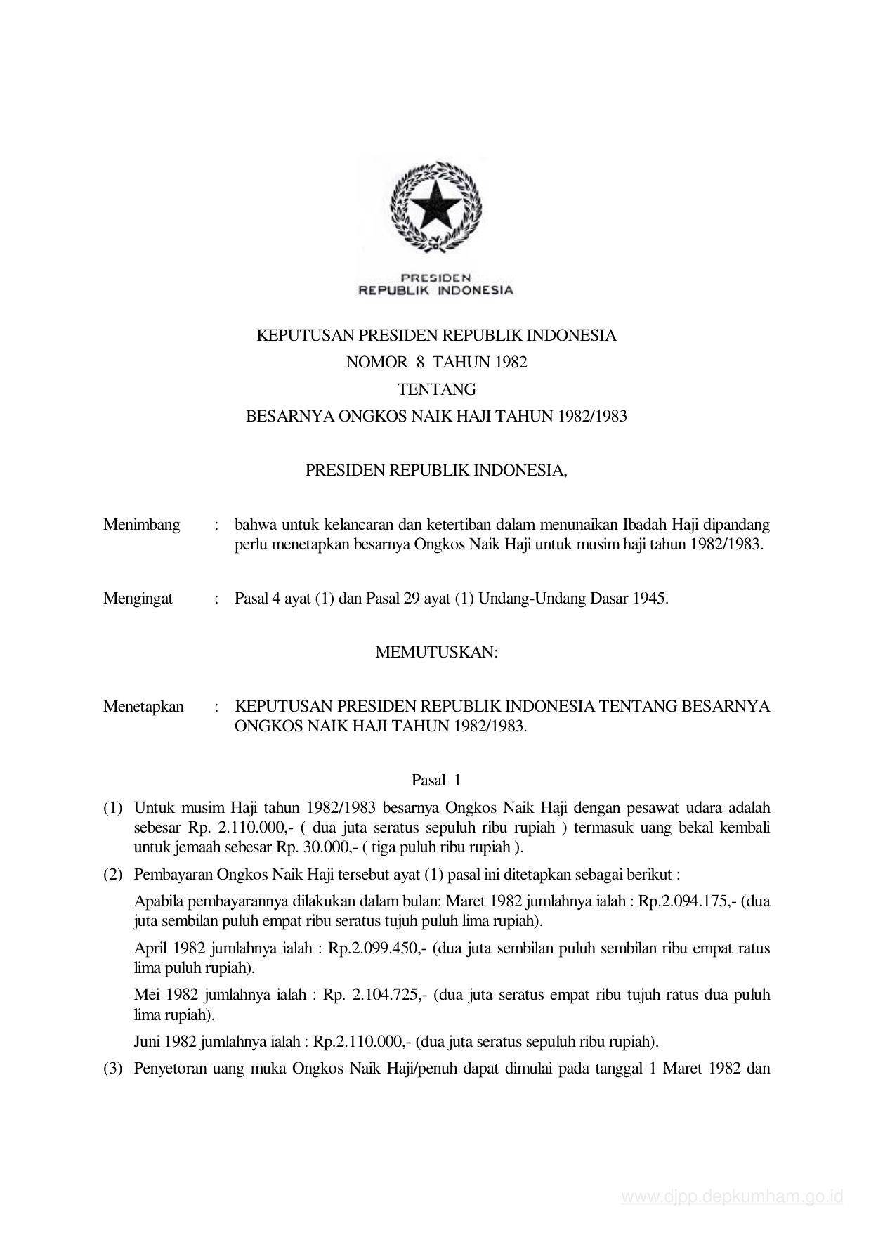 KEPPRES Nomor 8 Tahun 1982 | Keputusan Presiden Nomor 8 Tahun 1982 tentang BESARNYA ONGKOS NAIK HAJI TAHUN 1982/1983